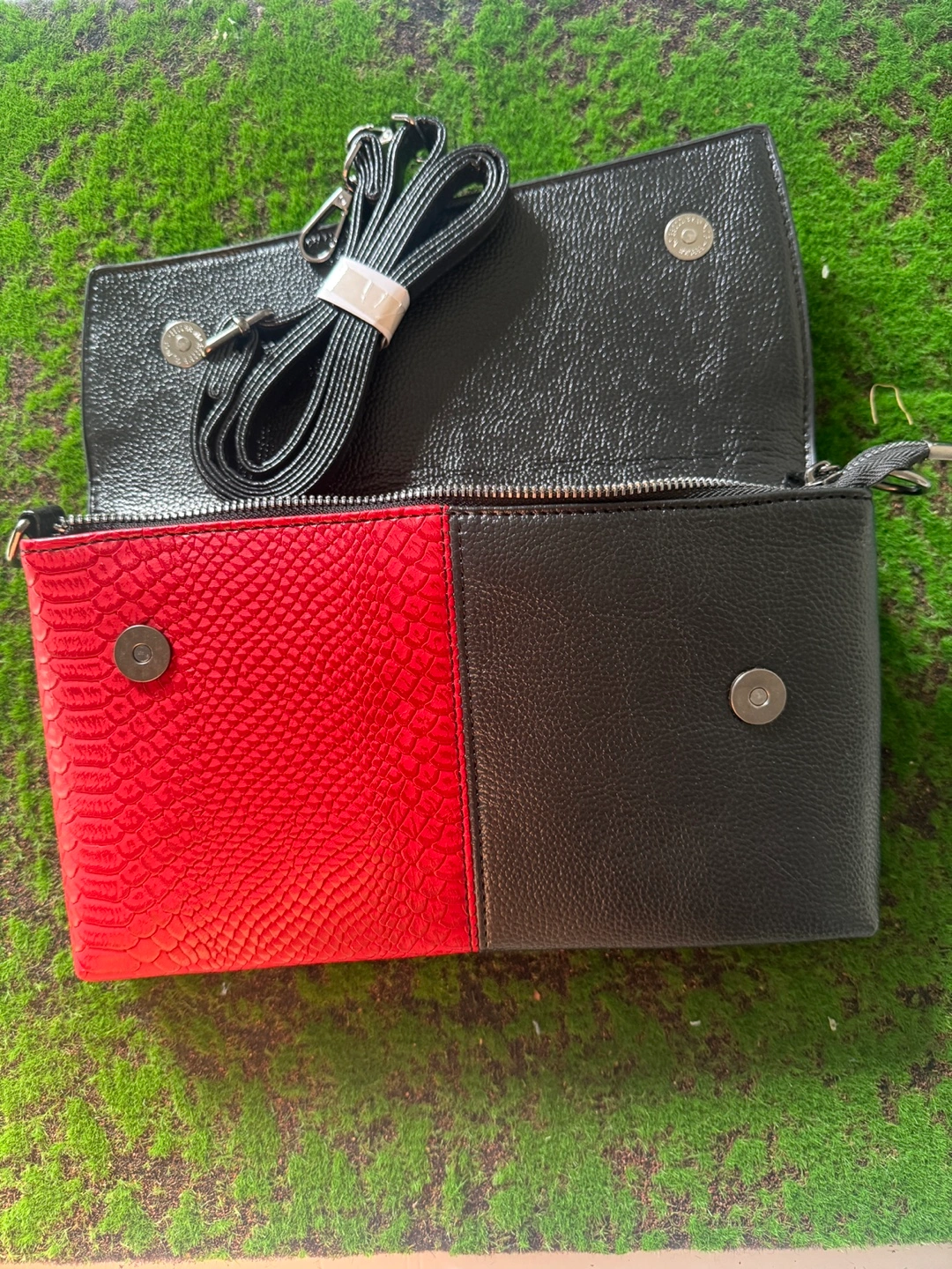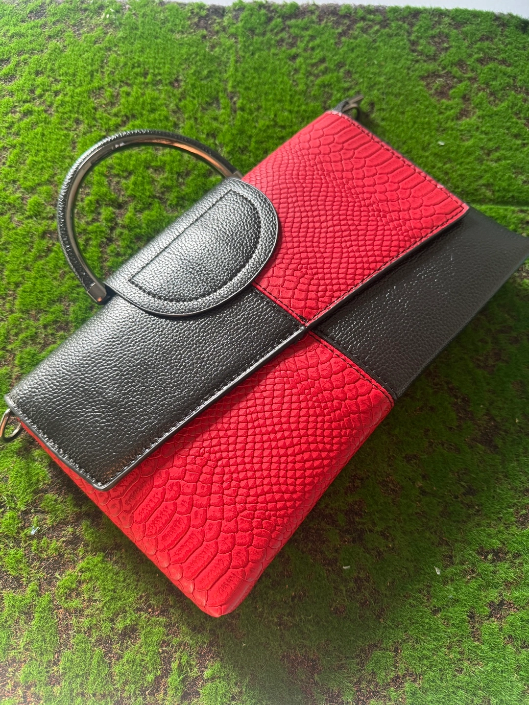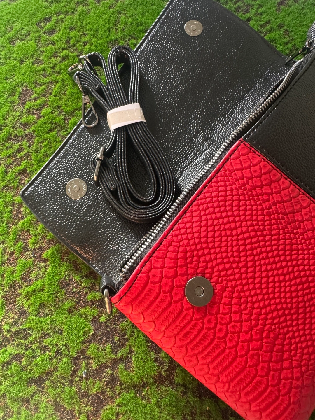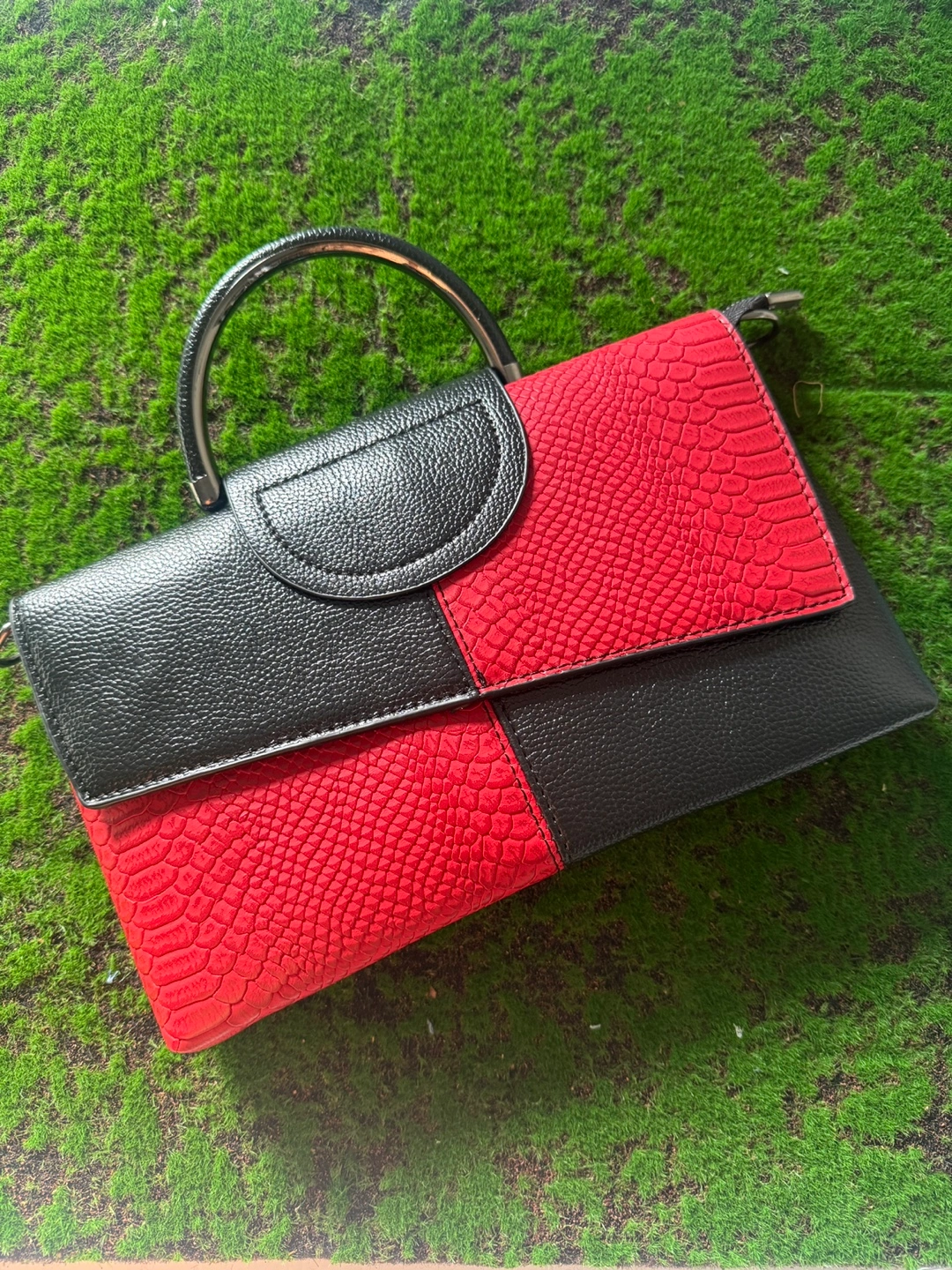 Selling a stylish colorblock handbag in red and black. It features a unique top handle and a detachable shoulder strap for versatile carrying options. The bag has a textured finish, adding a touch of sophistication to any outfit