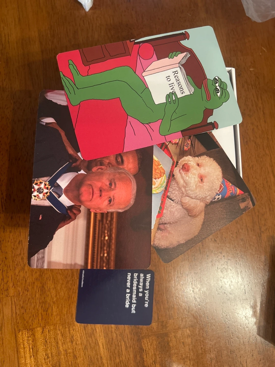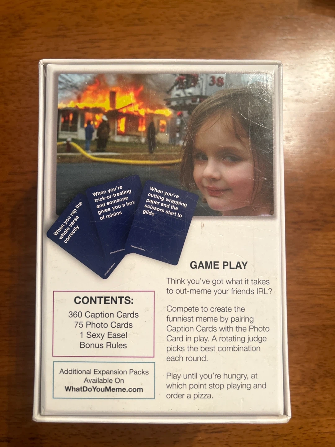 70Selling a What Do You Meme? adult party game! It's a fun game for meme-lovers. The box includes: - 360 Caption Cards - 75 Photo Cards - 1 Sexy Easel - Bonus Rules