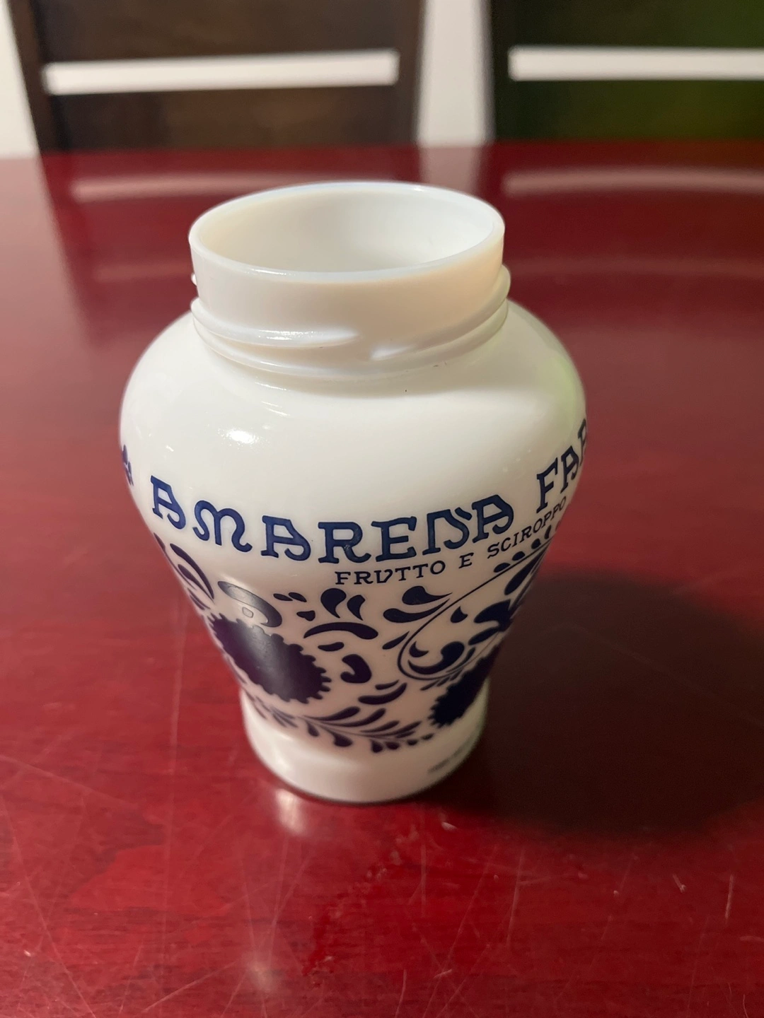 Selling a cute Amarena Fabbri Frutto E Sciroppo jar! It's a lovely white color with blue floral designs and text. Perfect for storing small items or as a decorative piece