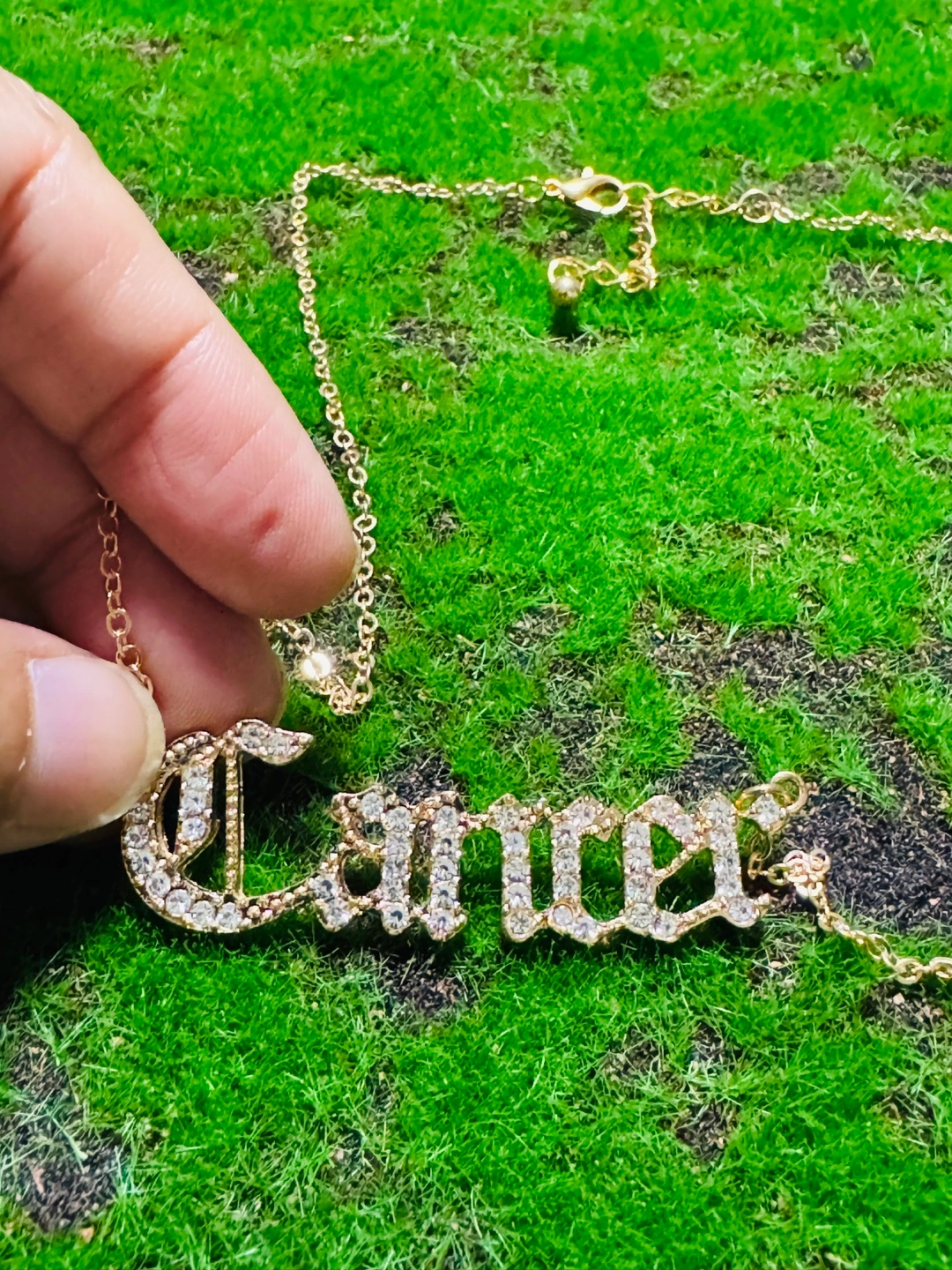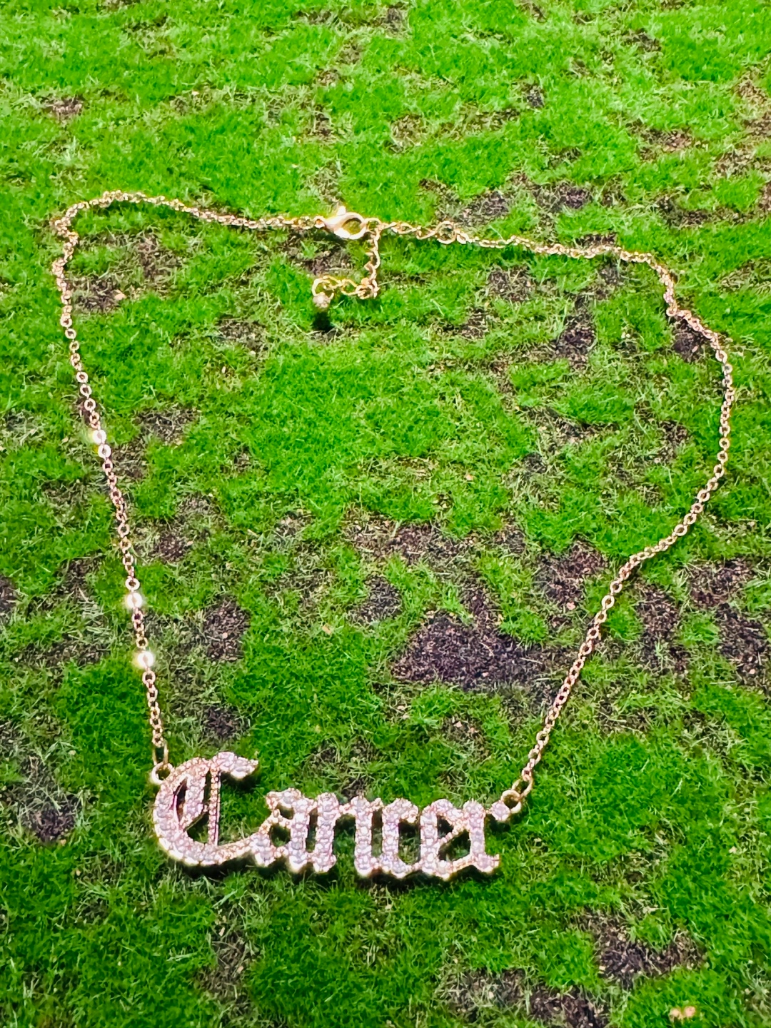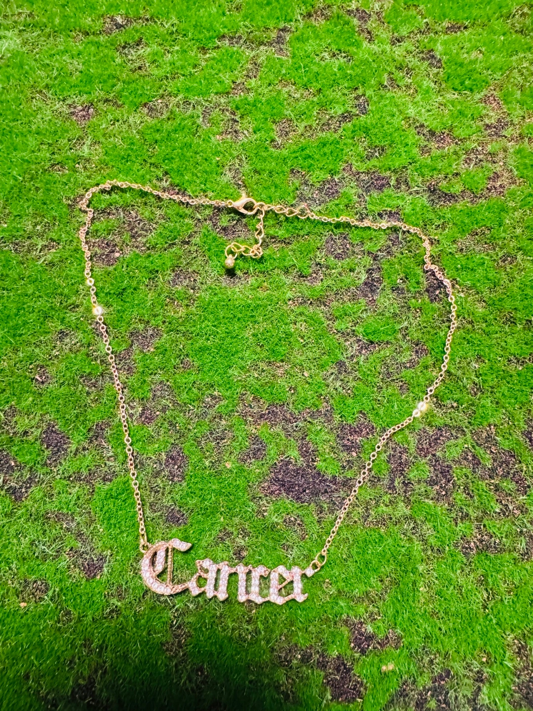 Selling a gold-colored necklace with a rhinestone-studded "Cancer" pendant! It's in great condition and perfect for anyone who loves astrology or wants to show off their zodiac sign