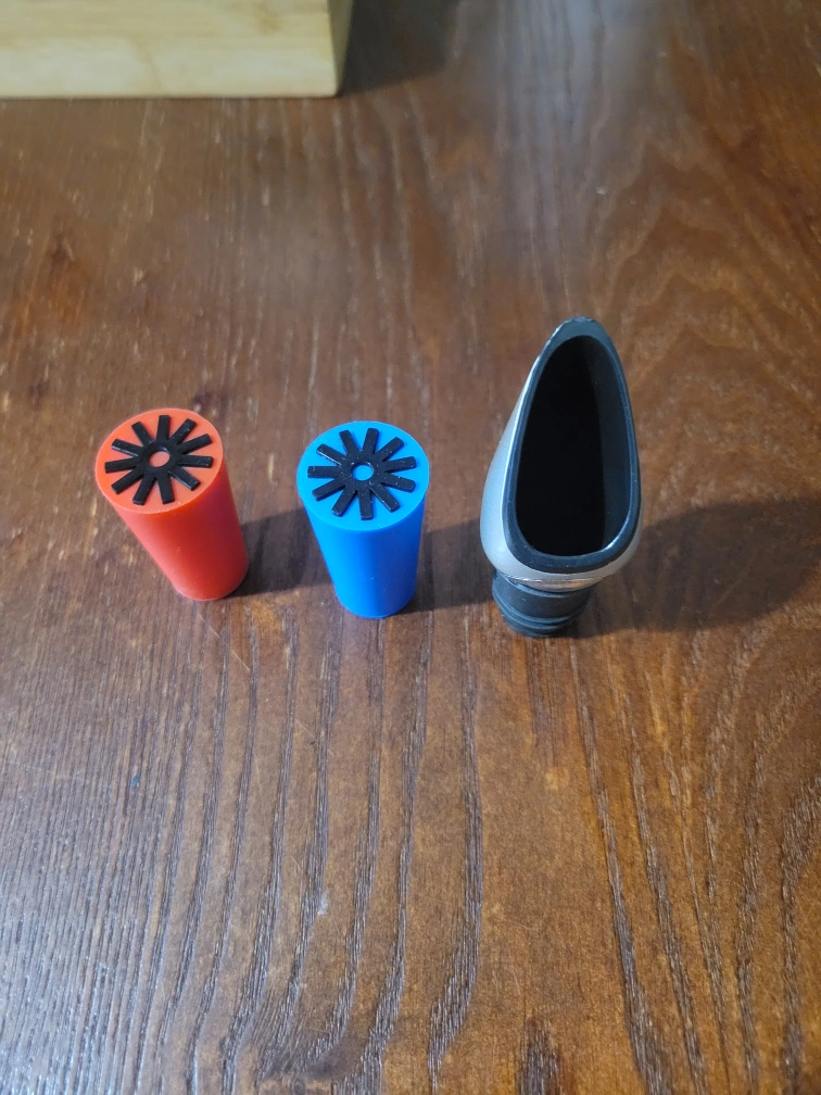 76A Metrokane wine pourer and 2 rubber wine stoppers (blue and red).