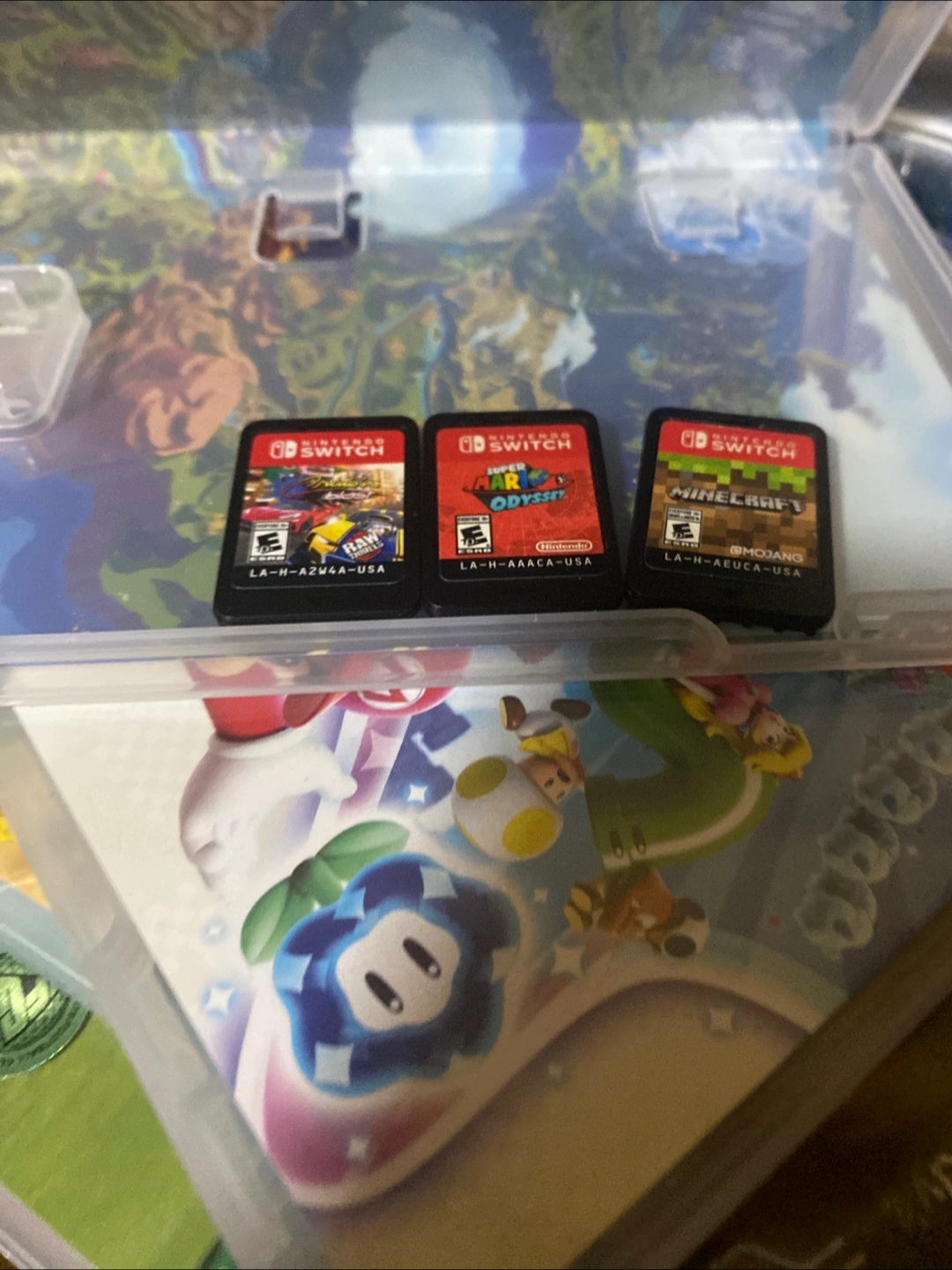 Selling three Nintendo Switch games together: Super Mario Odyssey, Minecraft, and Raw Thrills 40 each