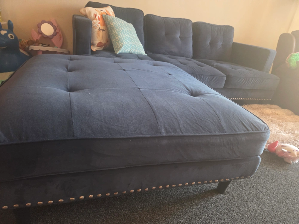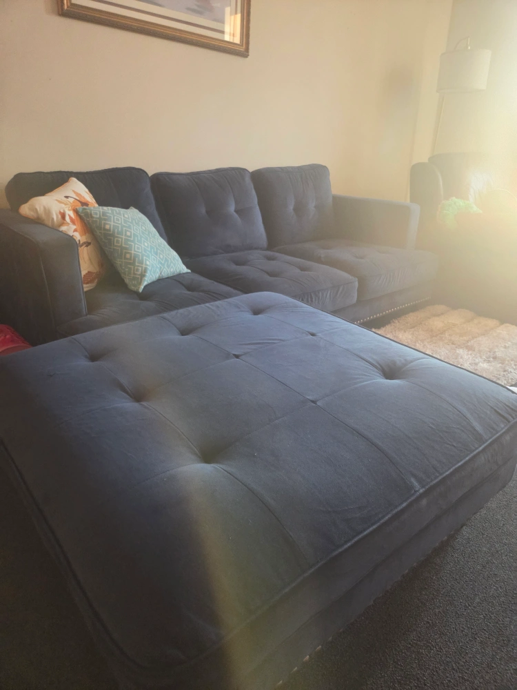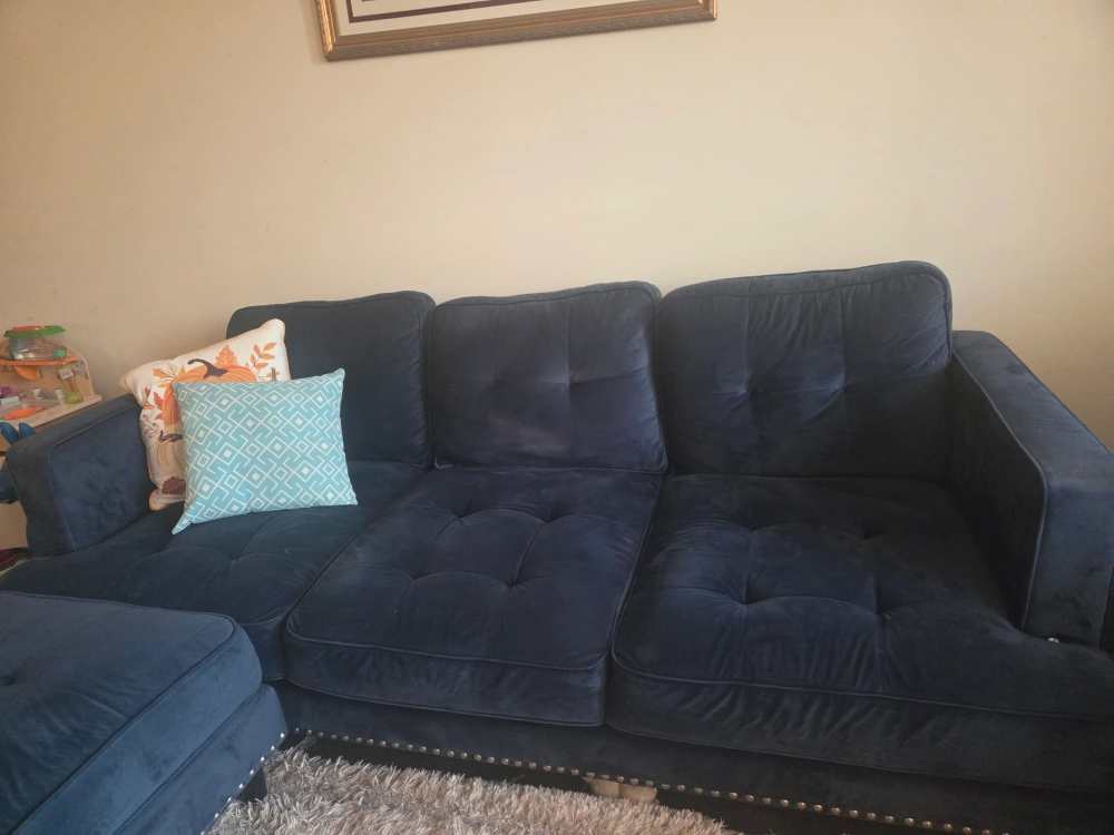 32Selling a comfortable navy blue sectional couch with a matching ottoman. It's in great condition and perfect for a living room or den. The sectional provides ample seating, and the ottoman can be used as a footrest or extra surface space. It's a stylish and functional addition to any home!