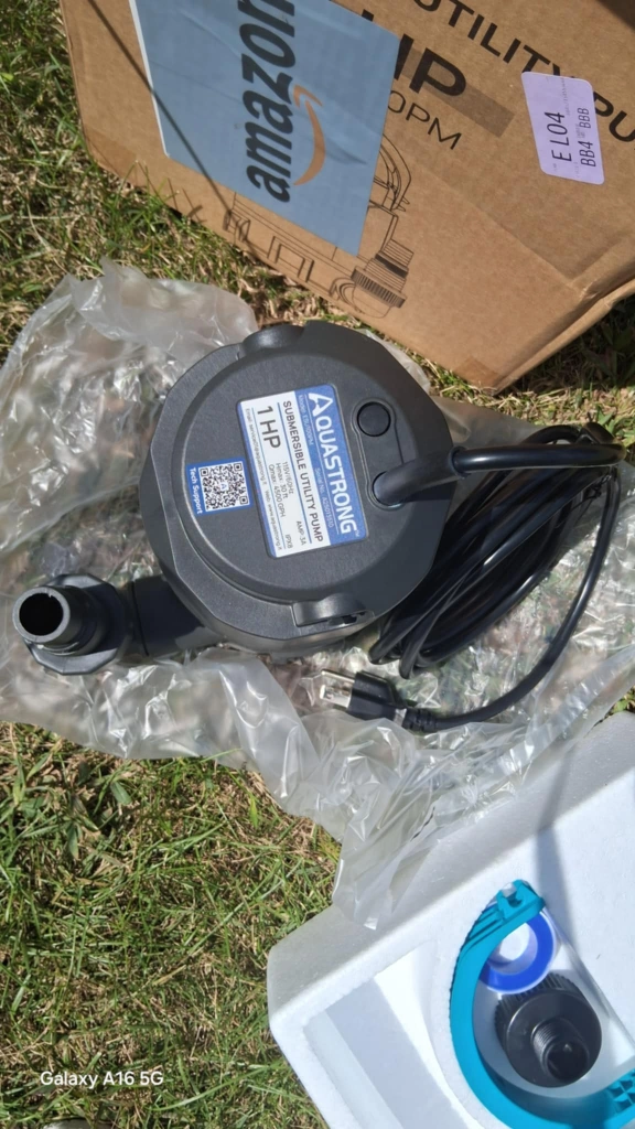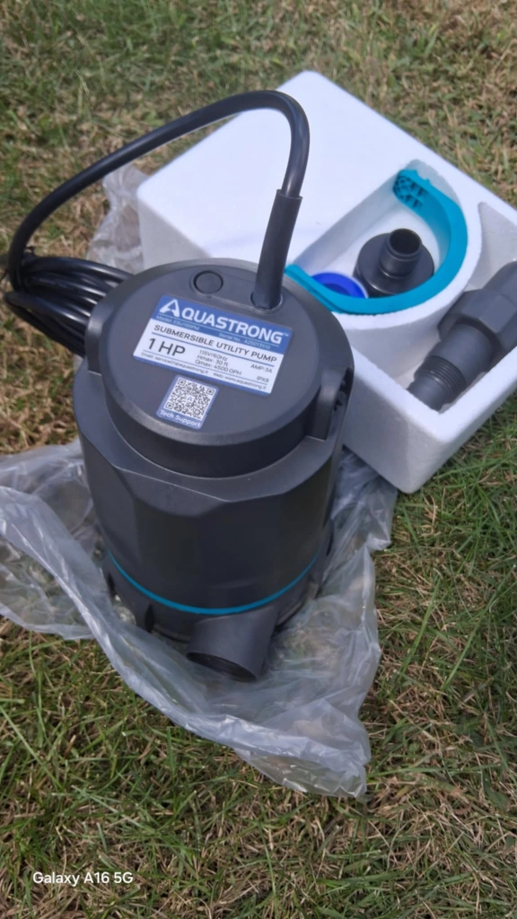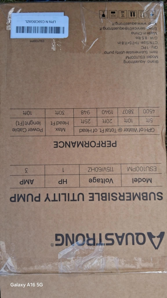 Selling an AquaStrong submersible utility pump. It's a 1 HP model, perfect for various water removal tasks. The box includes the pump and all original accessories. It is model ESU100PM, 115V/60HZ, and AMP is 3. the hose isn't included