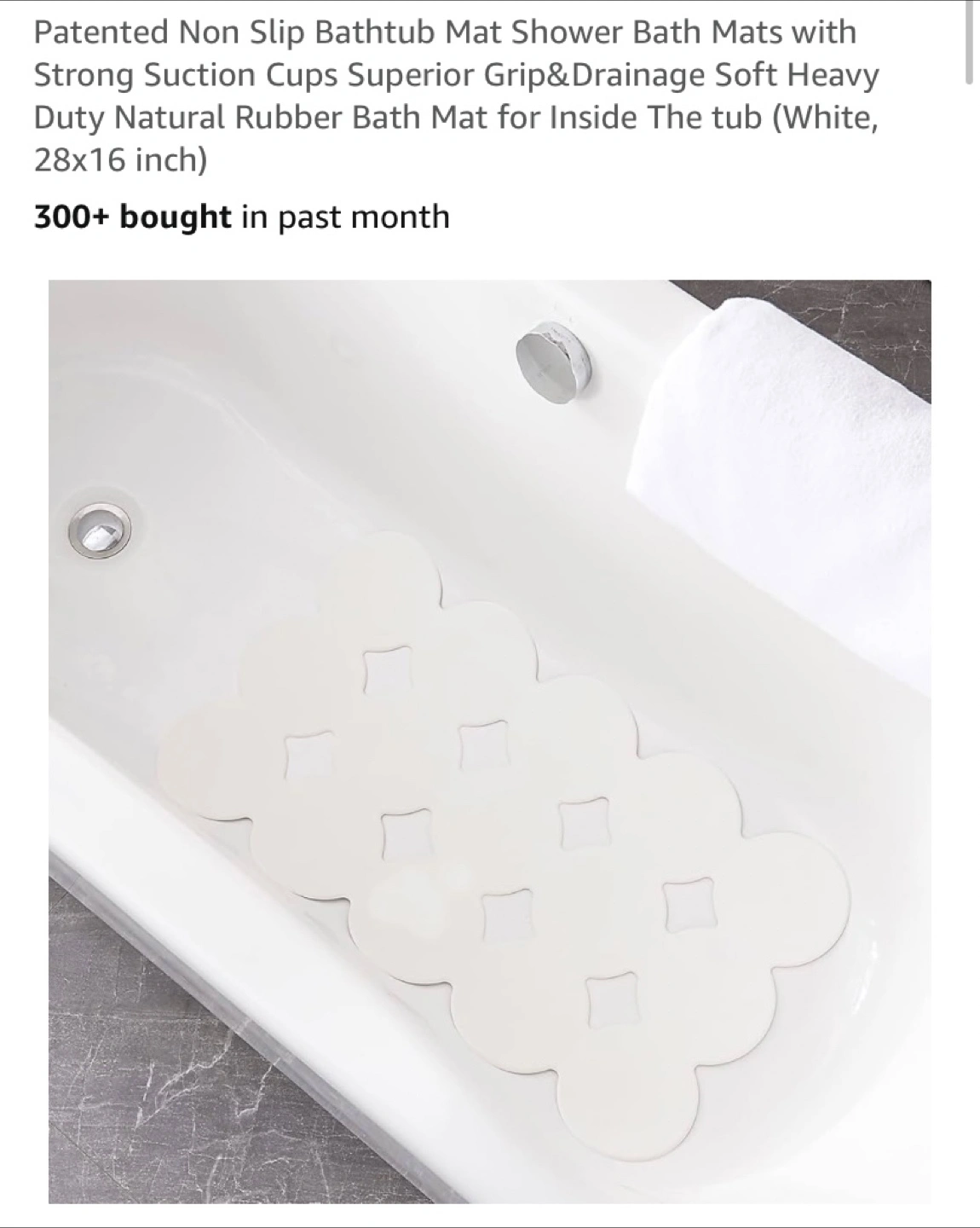 This is a patented non-slip bathtub and shower mat with strong suction cups for superior grip and drainage. It's a soft, heavy-duty natural rubber bath mat designed for inside the tub. The dimensions are 28x16 inches and it's white. New and never been used - purchased off Amazon. Pick up is near the Empire State building on Mondays - Wednesdays from 9 AM to 4 PM