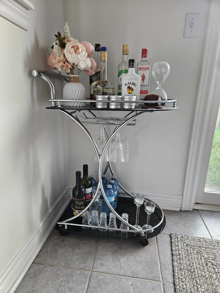 54Selling a rolling bar cart! It's perfect for storing and displaying your favourite drinks and glassware. It features a sleek design with multiple tiers and a convenient handle for easy moving. Great for entertaining!