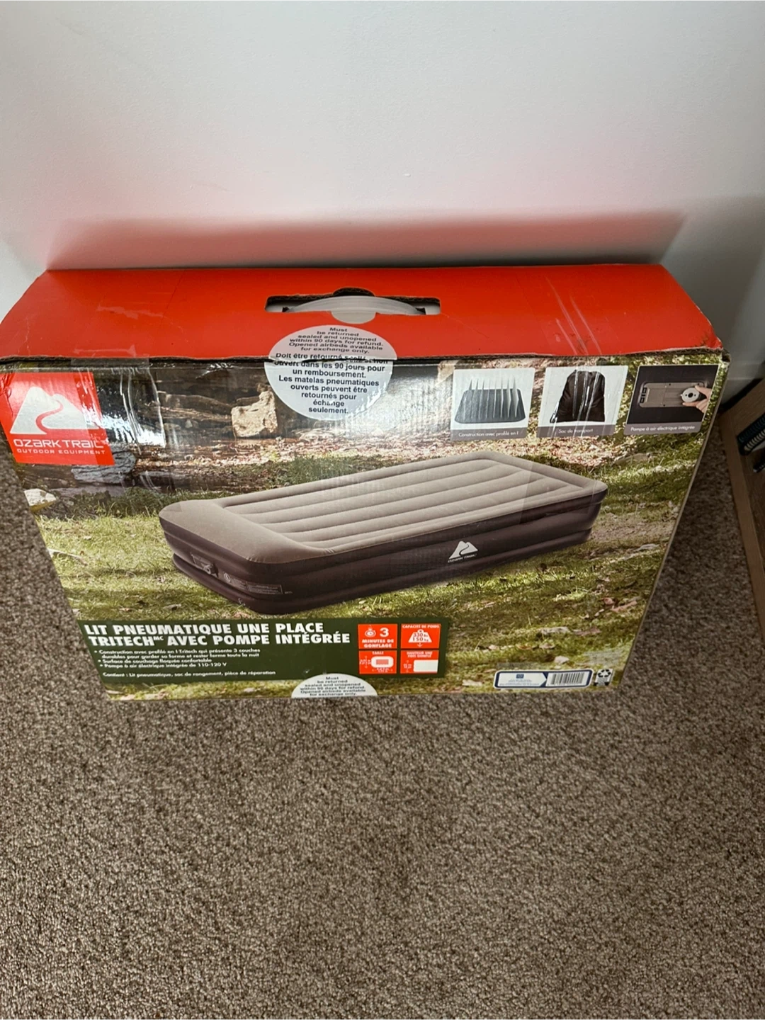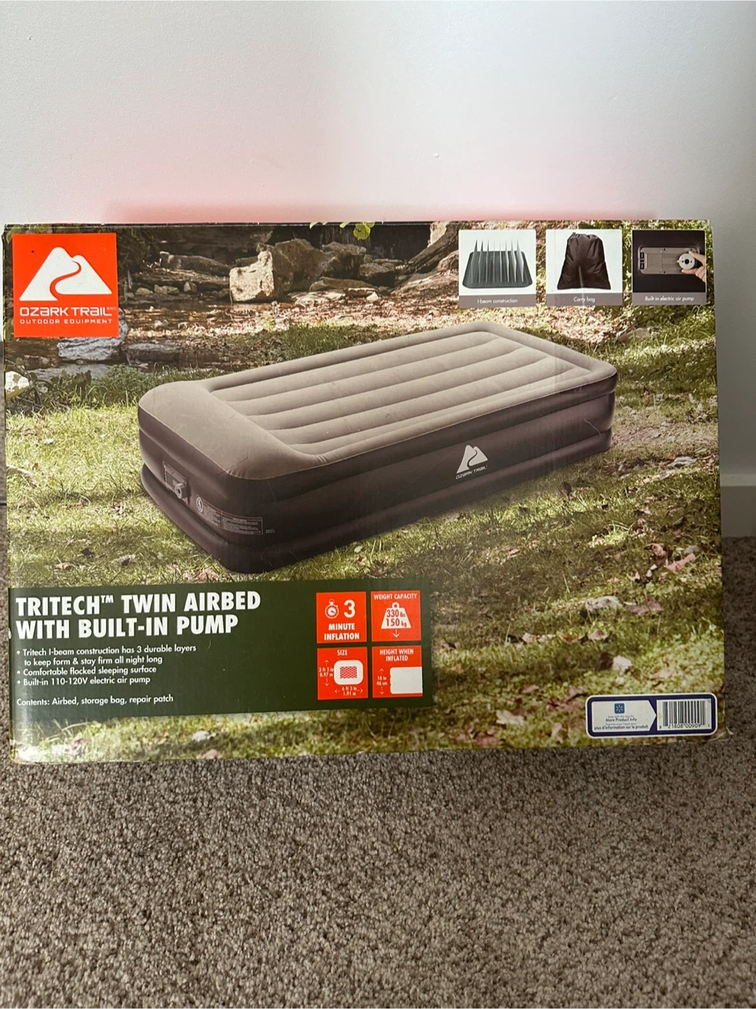 NEW Selling a brand new Ozark Trail Tritech Twin Airbed with a built-in pump! It's still in its original packaging.