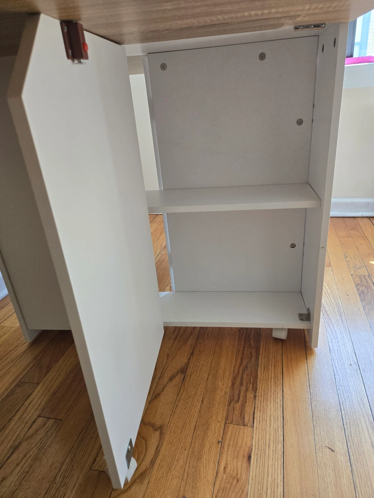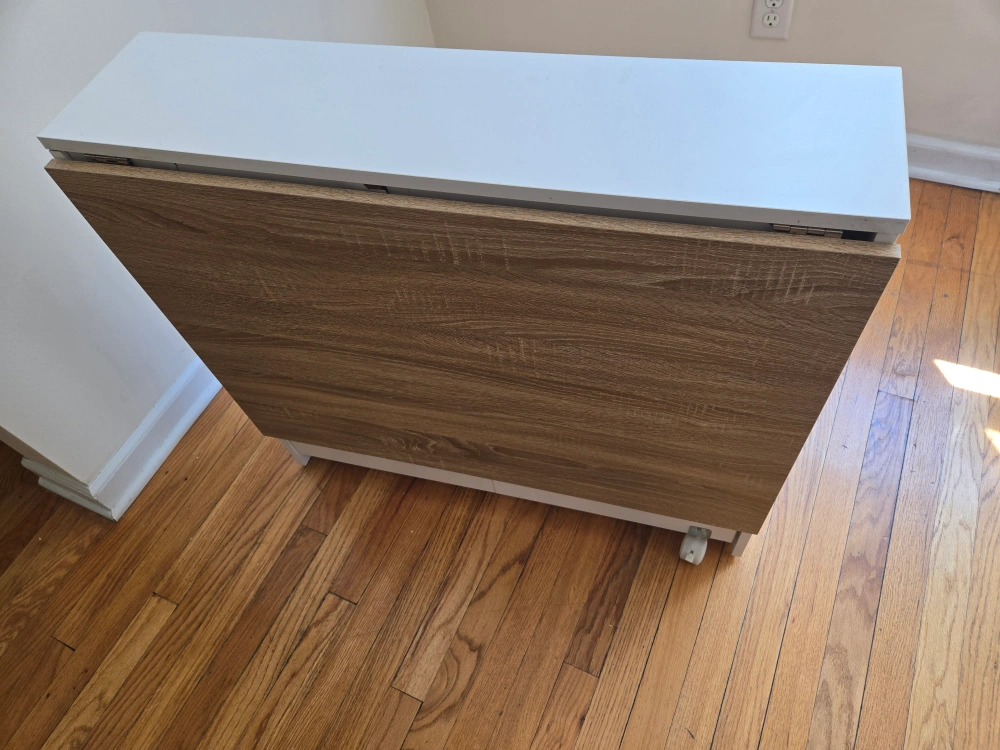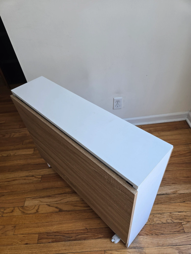 107Selling a foldable drop leaf dining table! It features a light wood grain finish paired with a white top. It's perfect for small spaces and can be easily folded away when not in use. There's also some storage space inside!