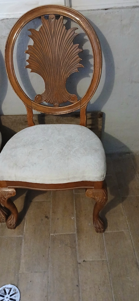 Selling a unique vintage wooden accent chair. It has a distinctive carved design on the back and ornate legs. The seat is upholstered with a patterned fabric. Perfect as an addition to your home decor! 2 available 30 each one or both for 50