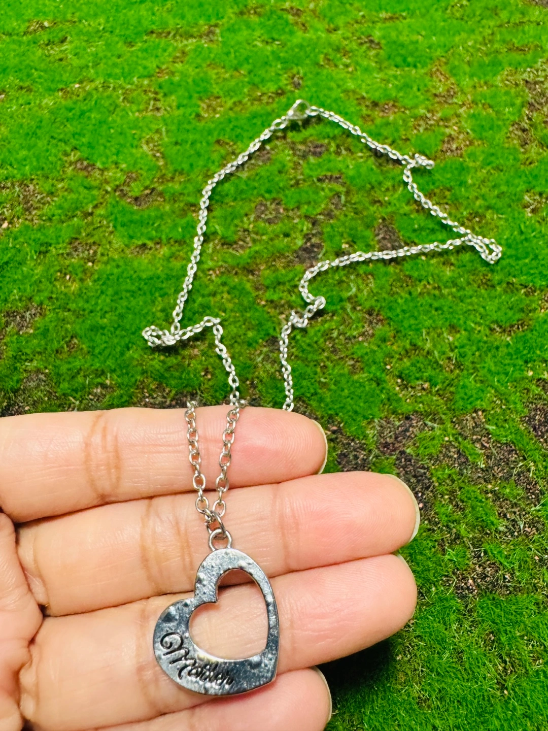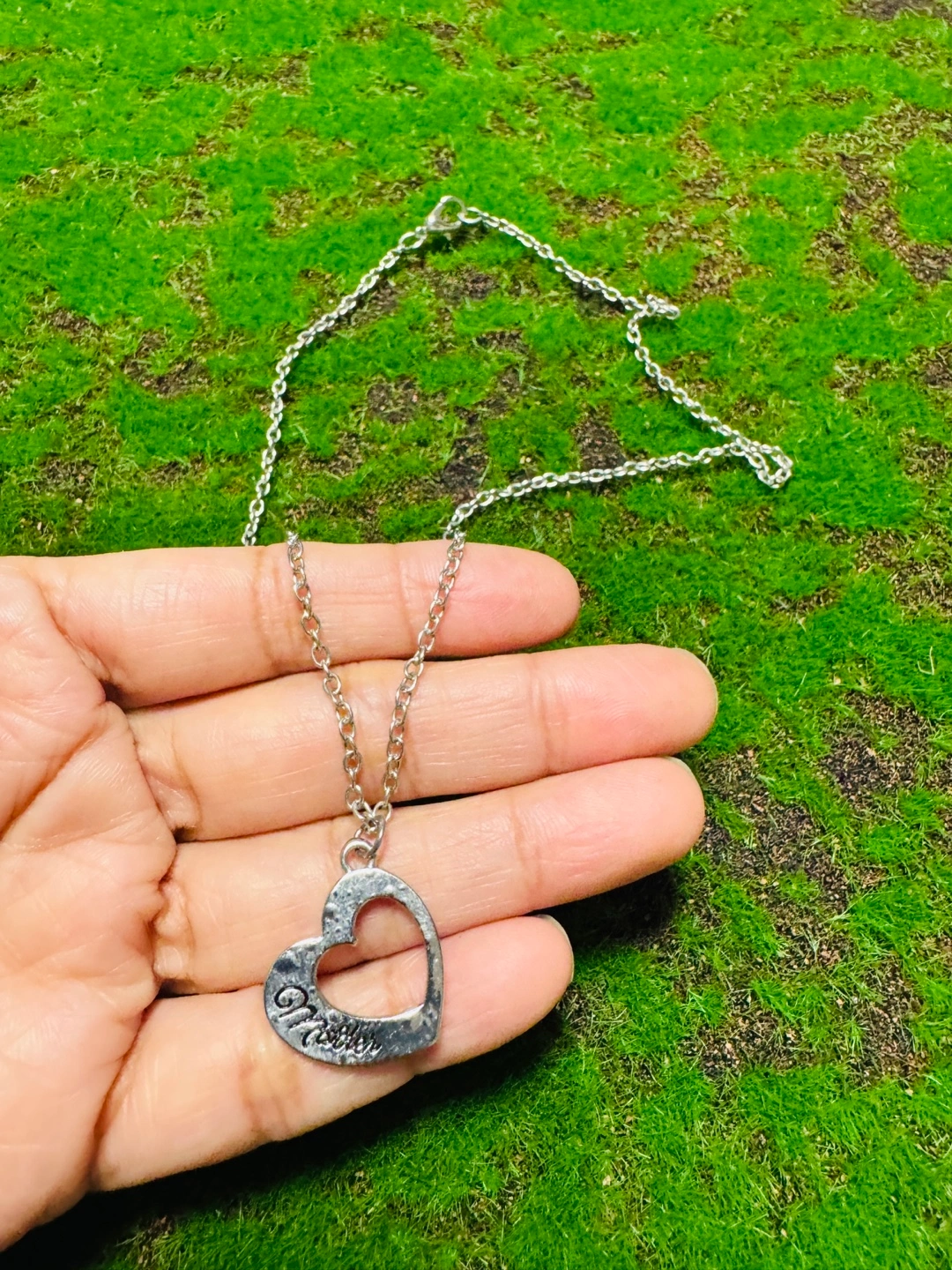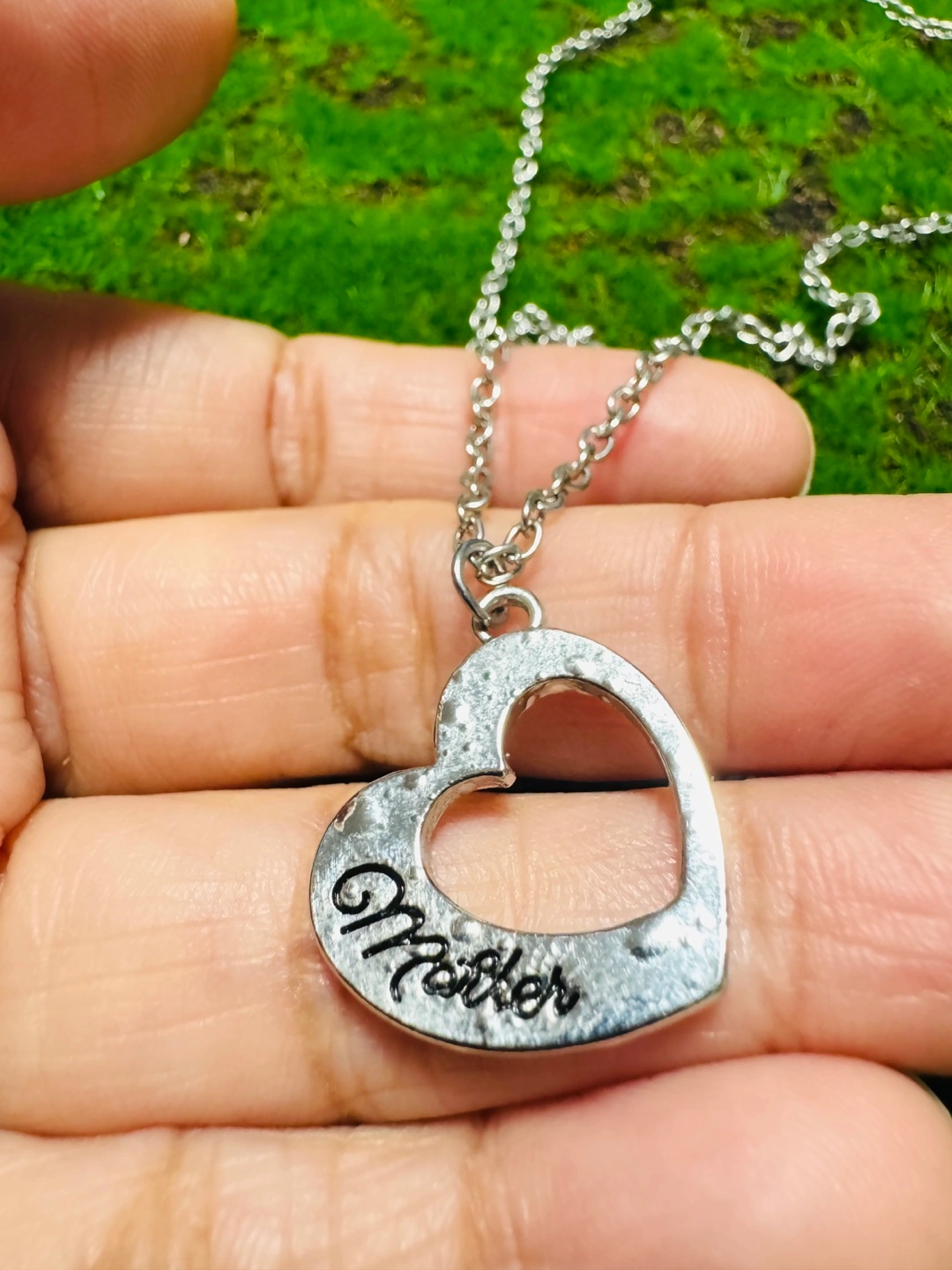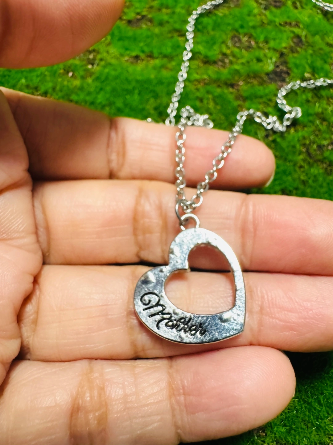 This is a lovely silver-colored necklace with a heart-shaped pendant. The word "Mother" is inscribed on the pendant. It's a sweet and simple piece!