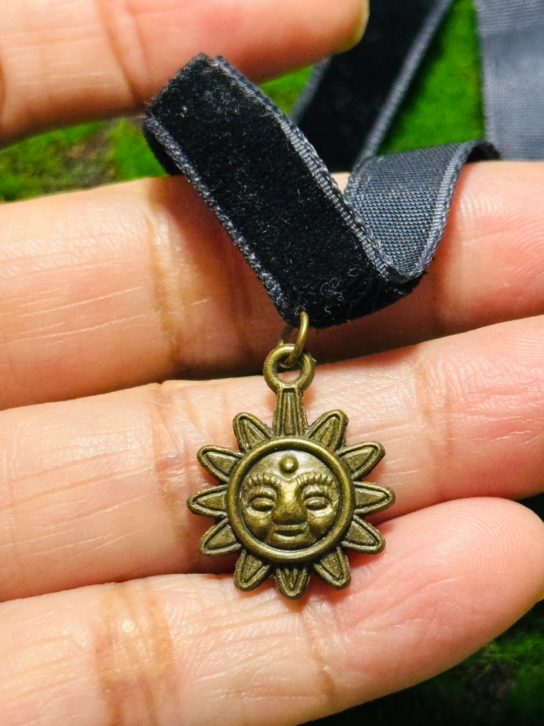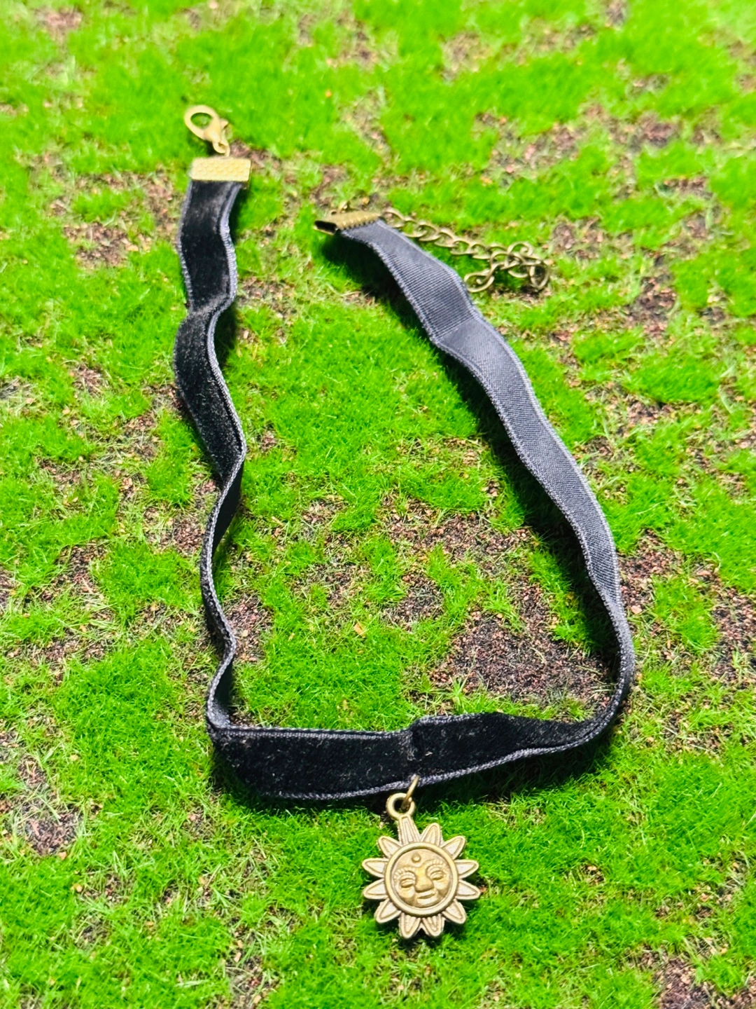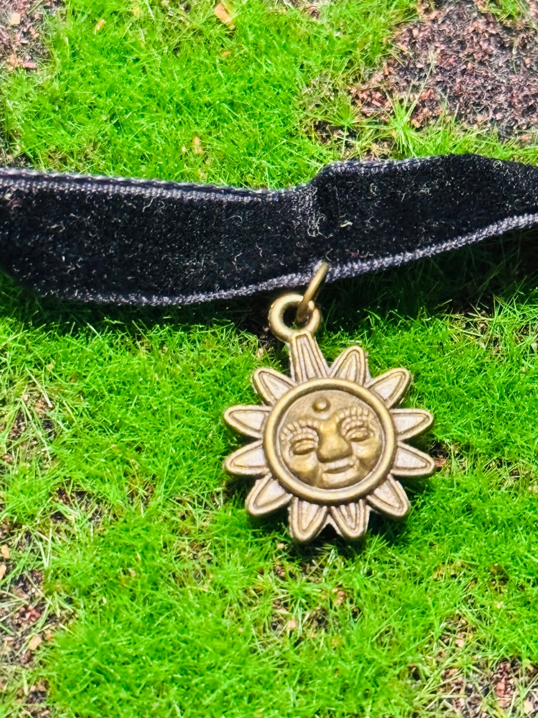 This is a cute black velvet choker with a sun pendant. It's in great condition and ready to add a little sunshine to your outfit!