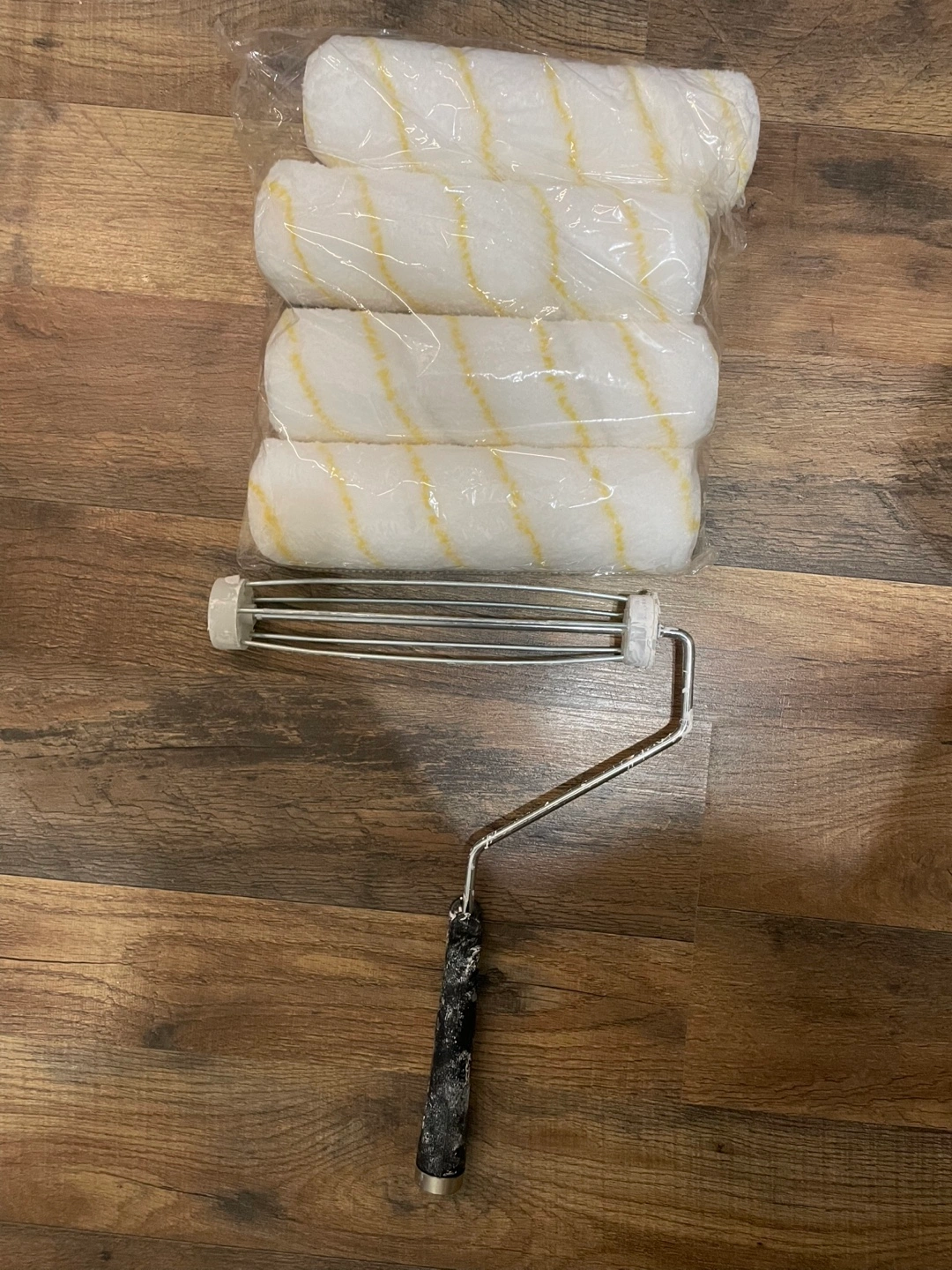 Selling a set of paint rollers with a handle. The rollers appear to be unused and still in their original packaging. The handle shows some signs of use, as pictured.