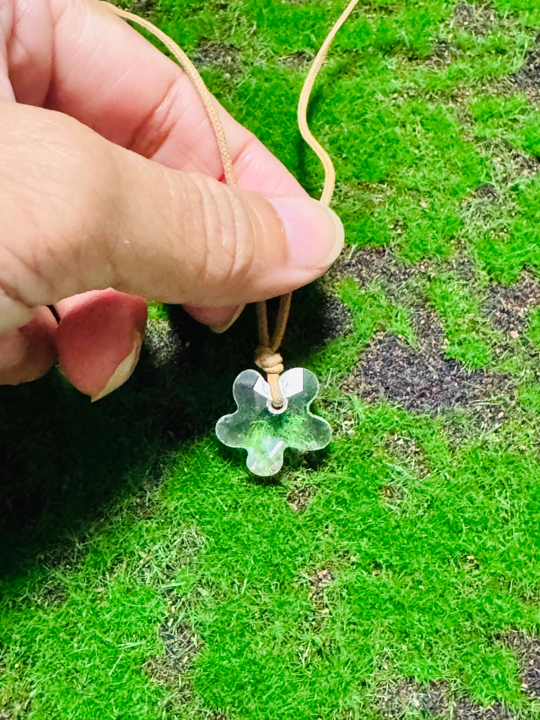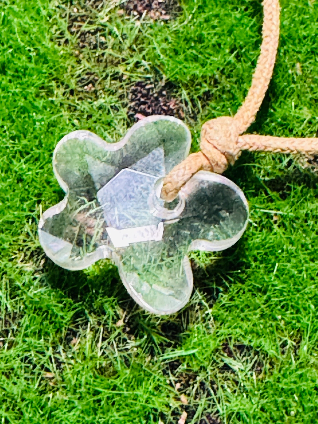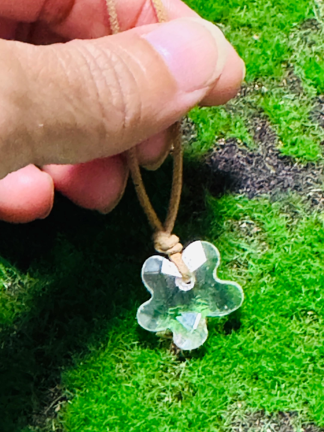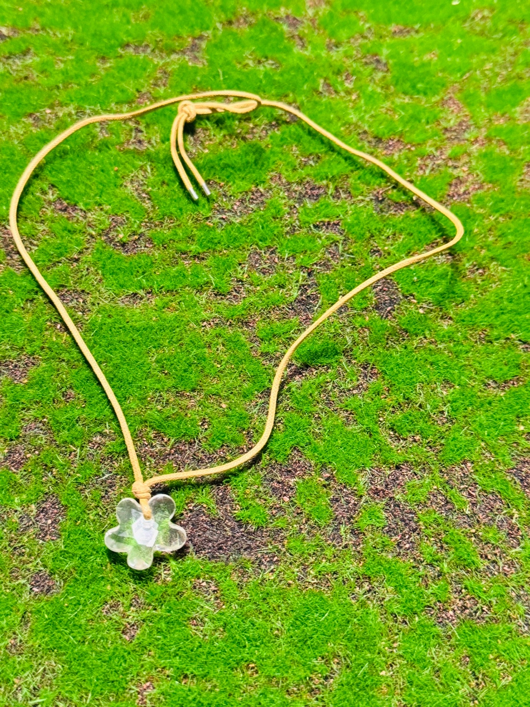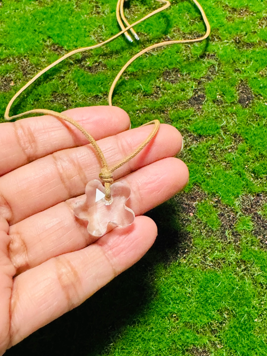 Here's a cute flower pendant necklace! It has a clear, crystal-like flower pendant on a tan cord. It's in great condition and ready to add a touch of floral charm to your outfit.
