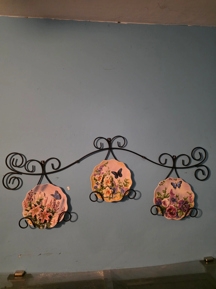This is a decorative wall hanging featuring three plates with floral and butterfly designs. It adds a touch of charm to any room!