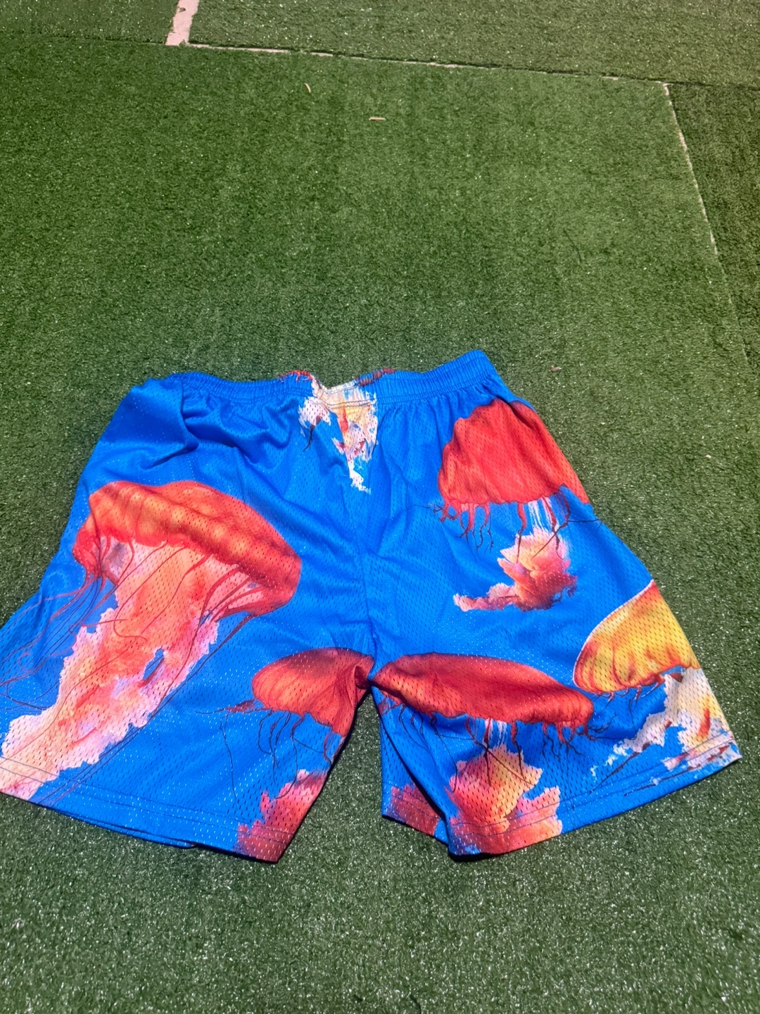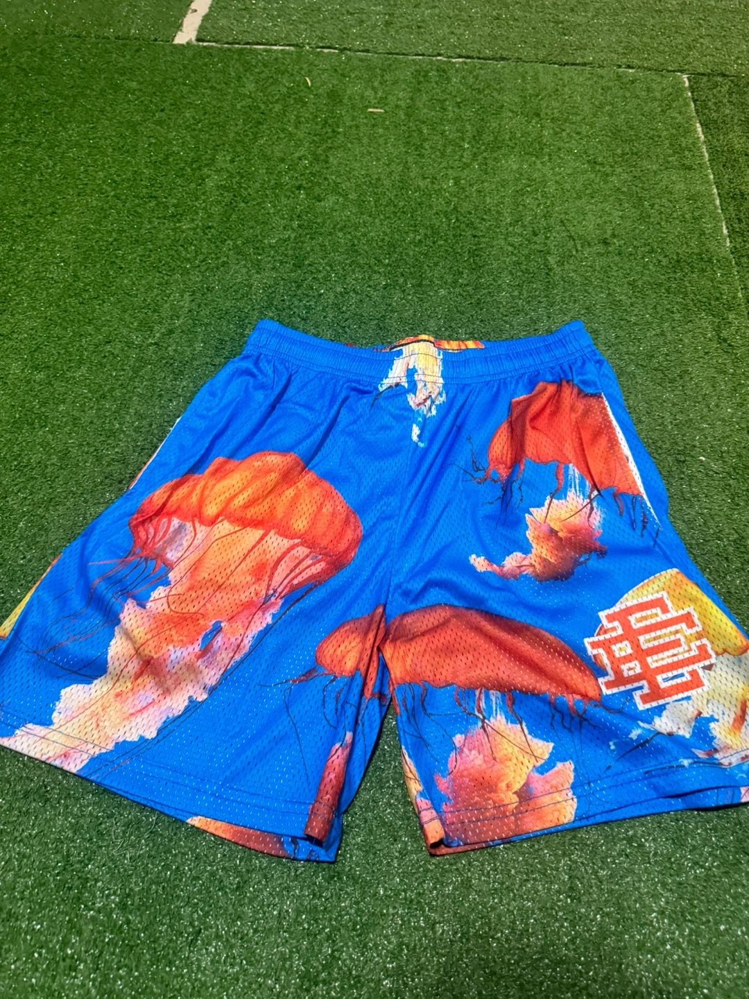 Selling a pair of Eric Emanuel EE shorts in size M and L. They feature a cool jellyfish design on a blue background. The shorts are made in New York.