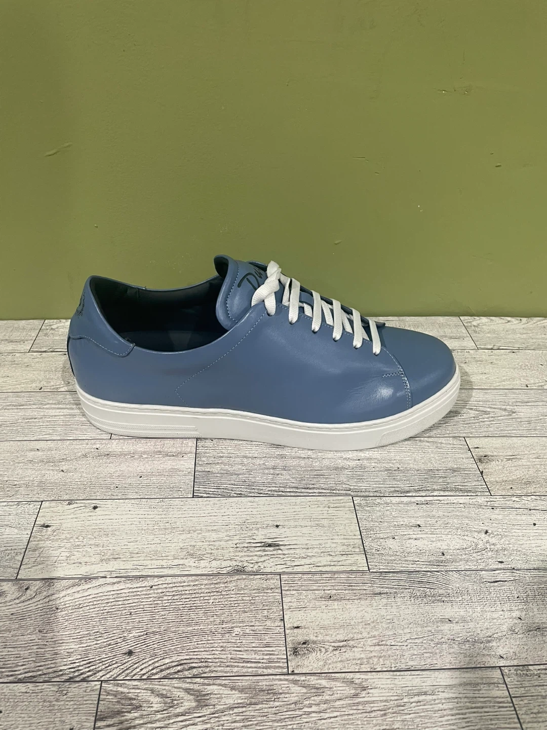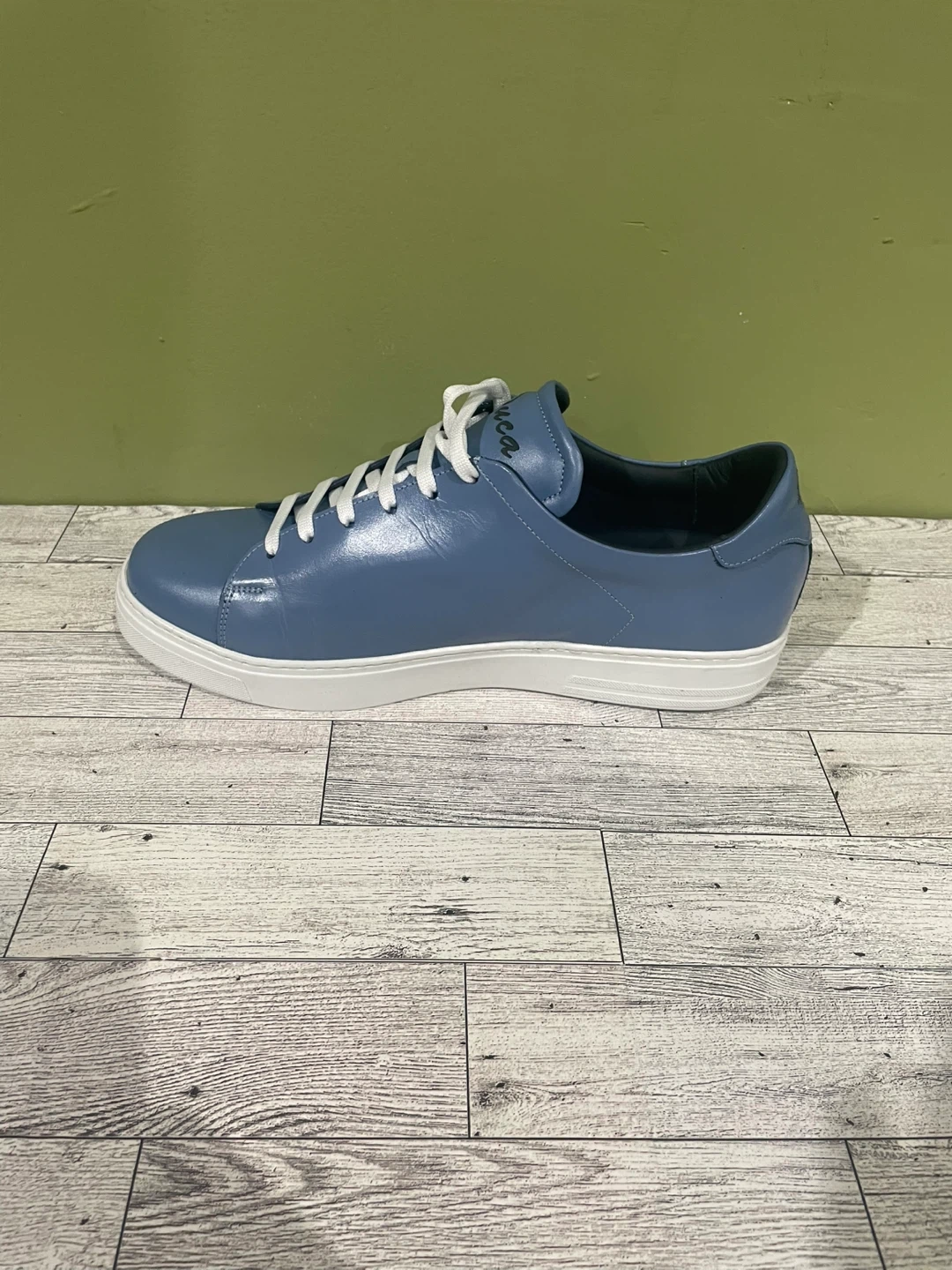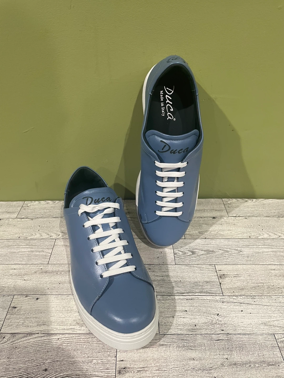 These Duca sneakers are new in box and ready for a new home! They're a stylish light blue leather with white soles and laces. Perfect for casual wear.