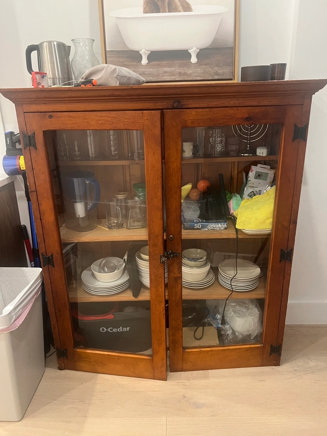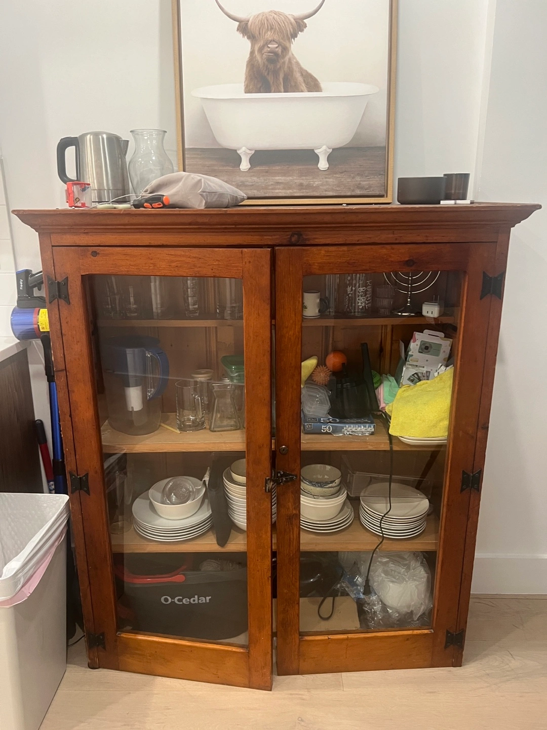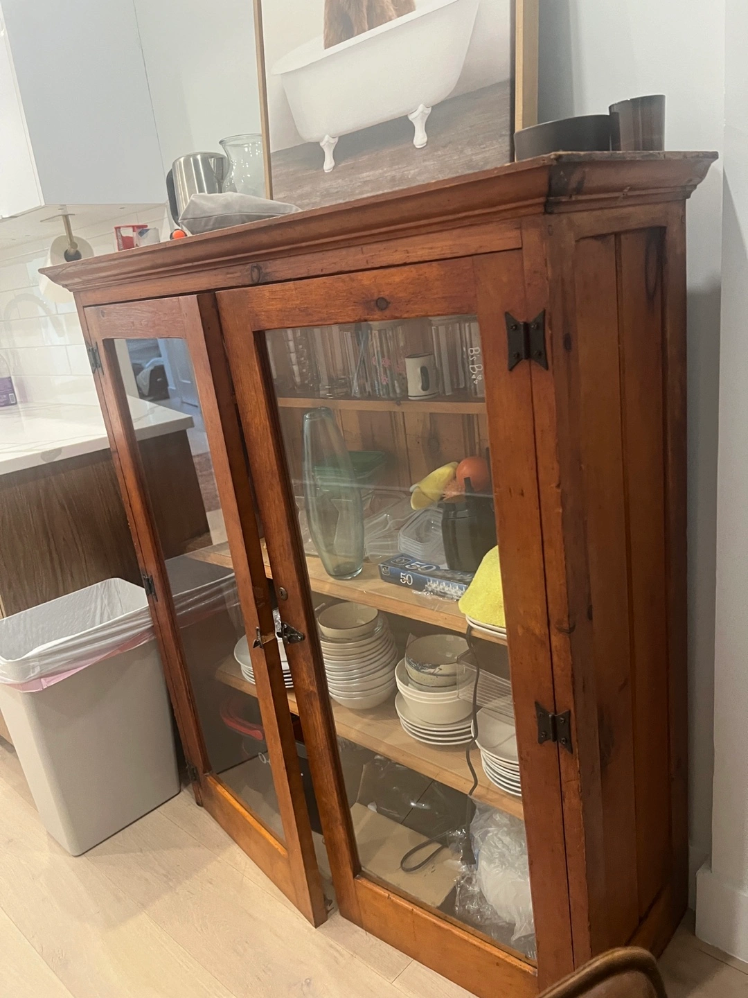 Selling a wooden display cabinet with glass doors. It's a beautiful piece for displaying your favorite items. The cabinet has a warm, rustic look and plenty of shelf space for storage and display