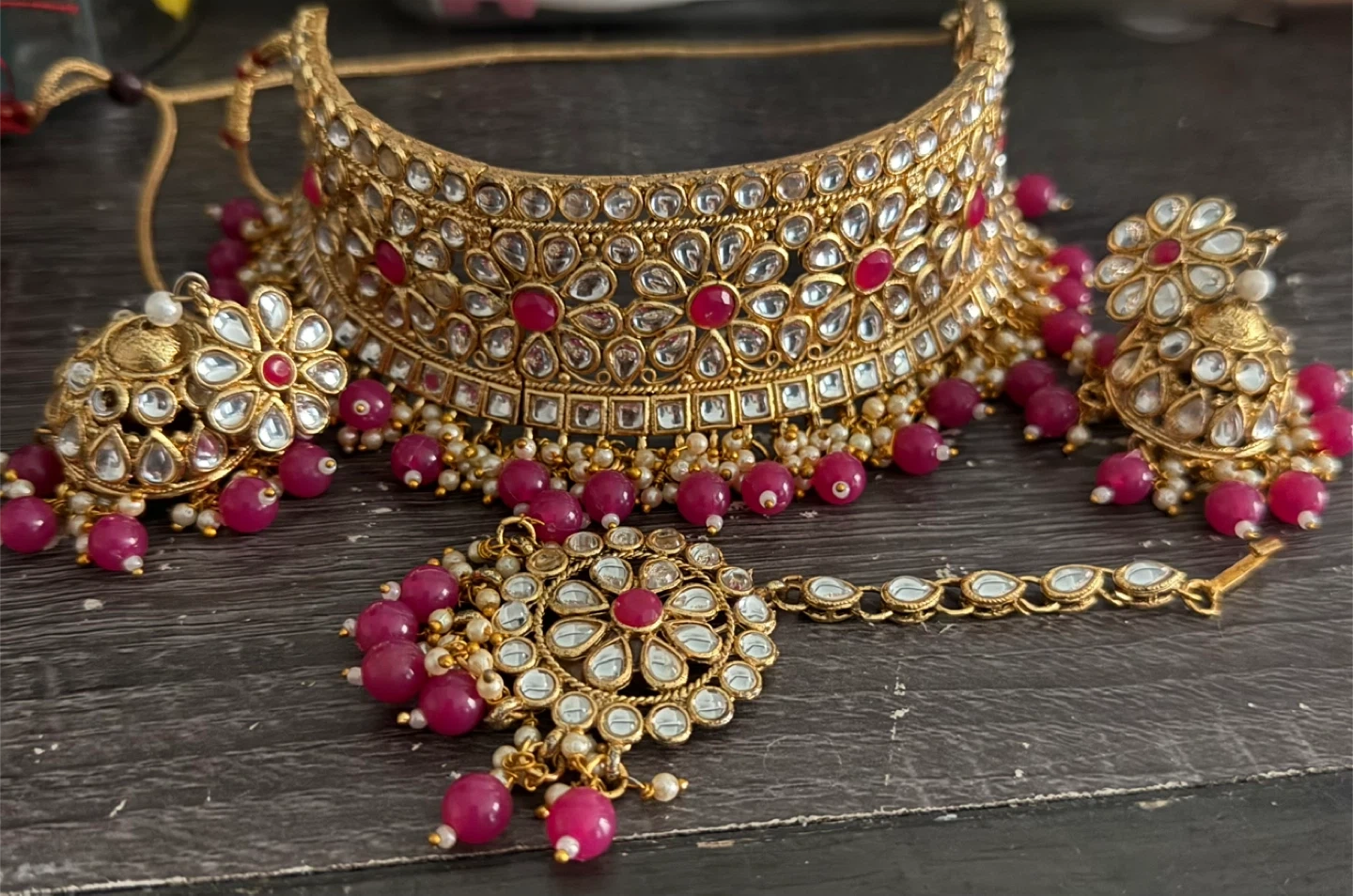 Beautiful Indian jewelry set in a gold tone with pink bead accents. Includes a choker-style necklace, matching earrings, and a headpiece (tikka). Perfect for a special occasion!