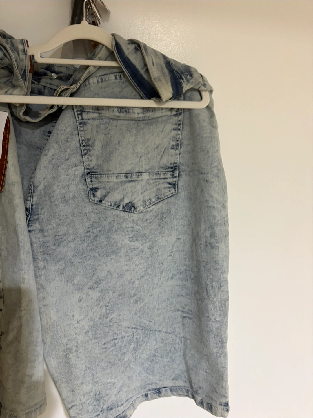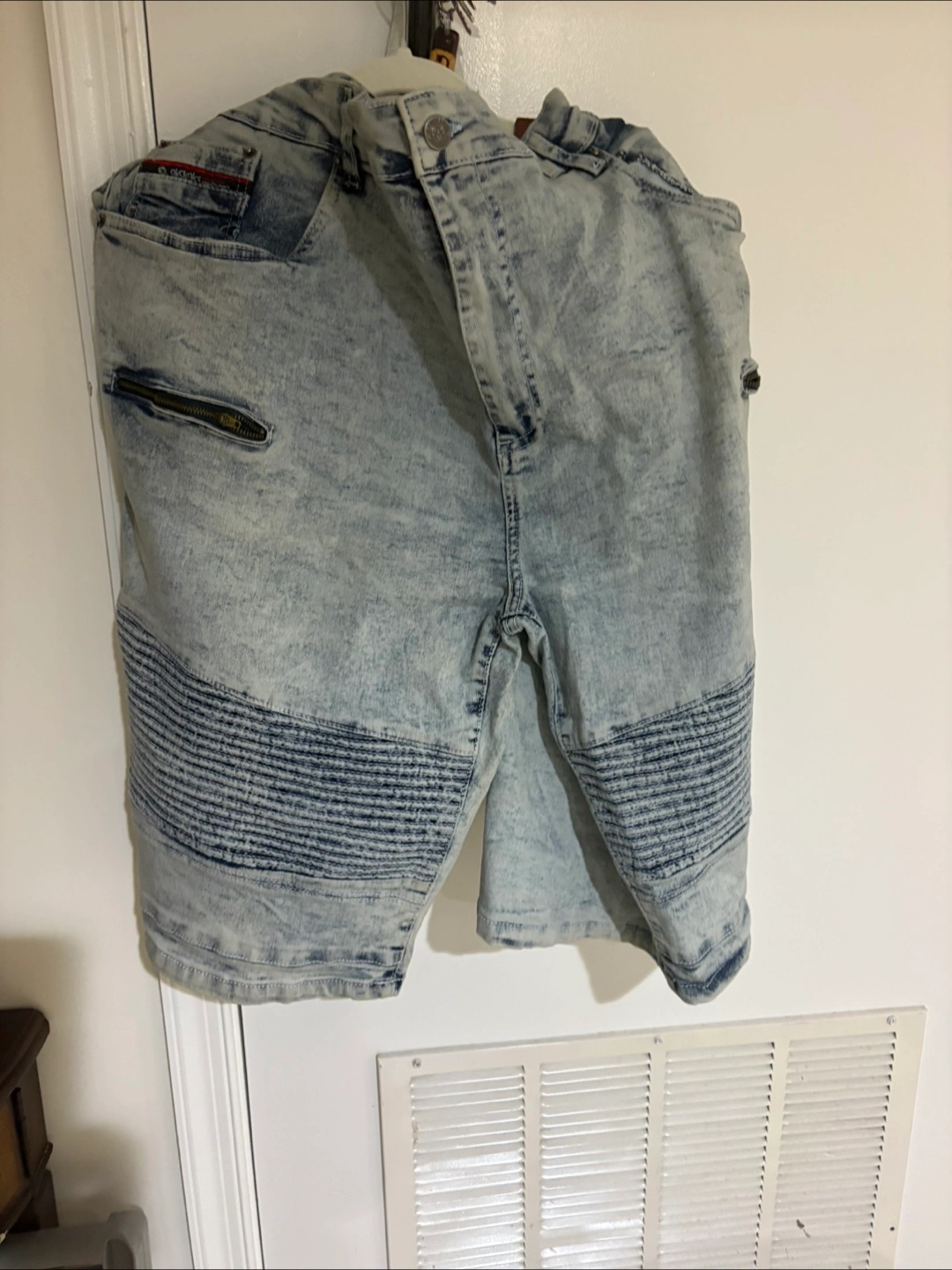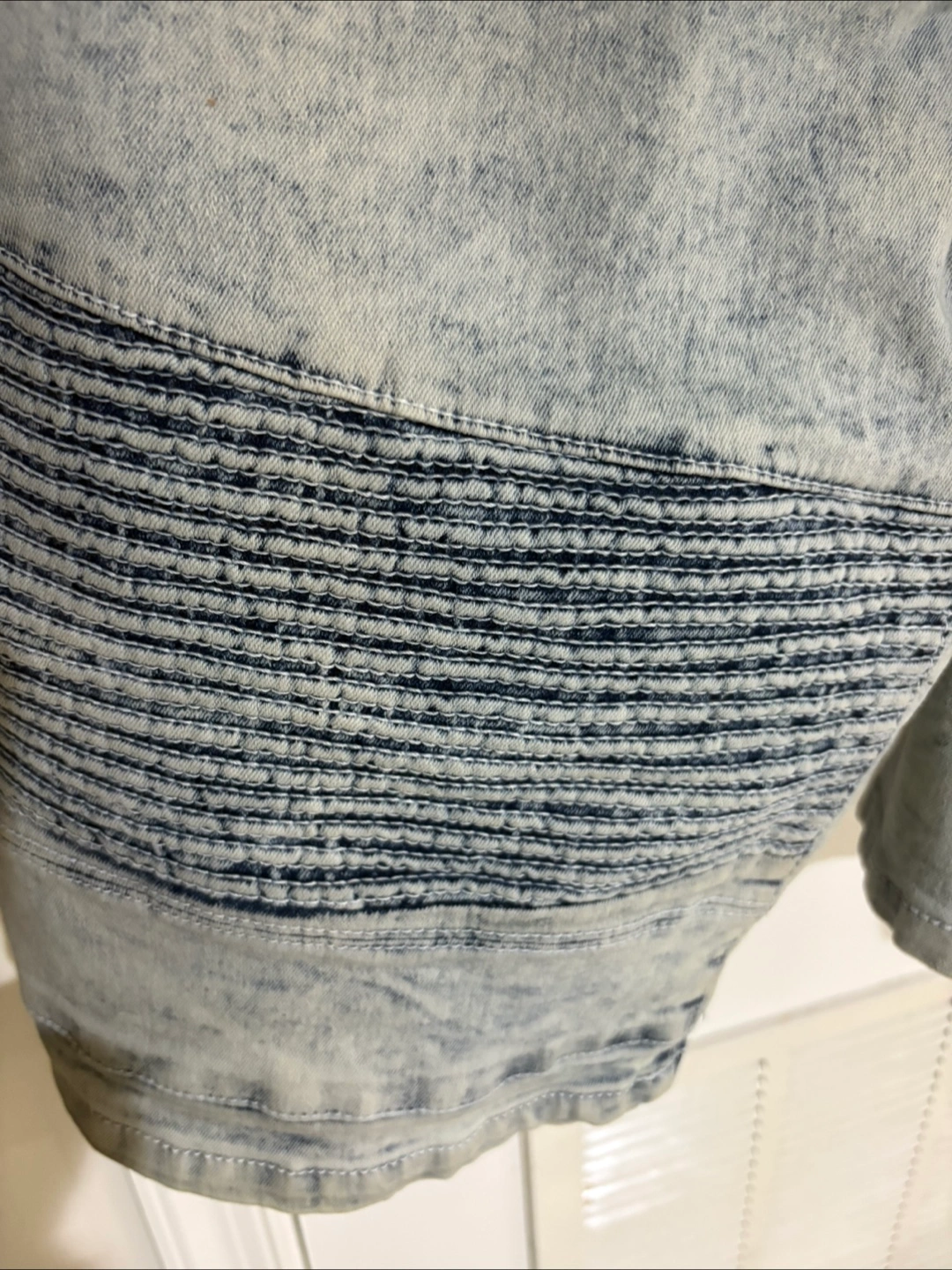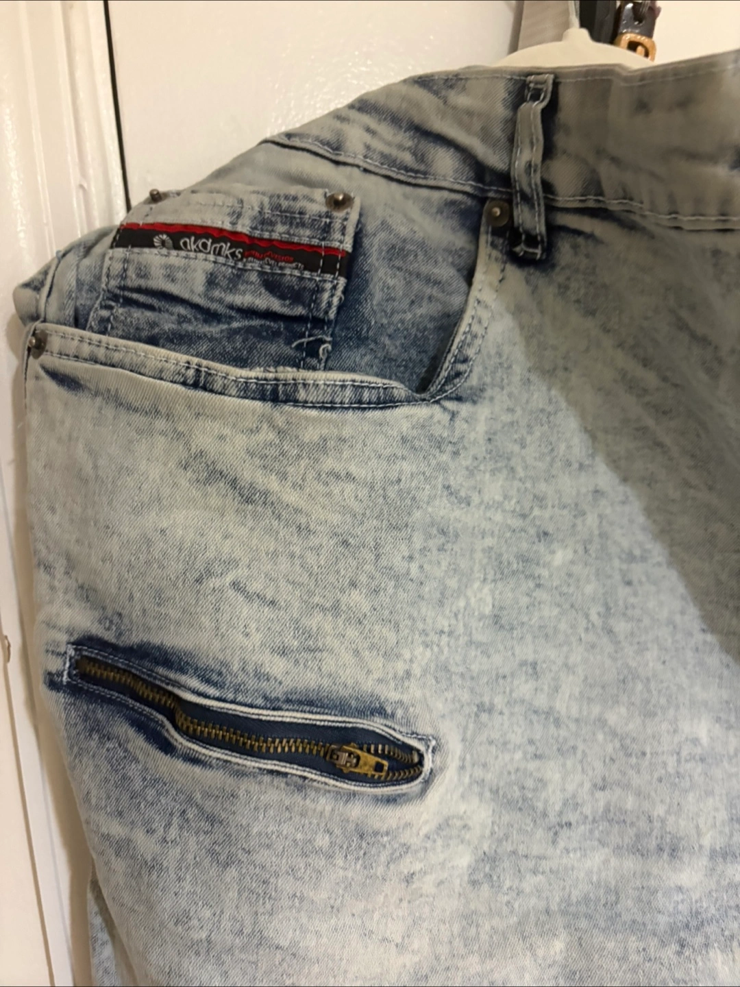 1000+Giving away a pair of Akomplice denim shorts, size 46. They feature a unique acid wash and stylish details like a zippered pocket and textured accents. Great for a casual look!