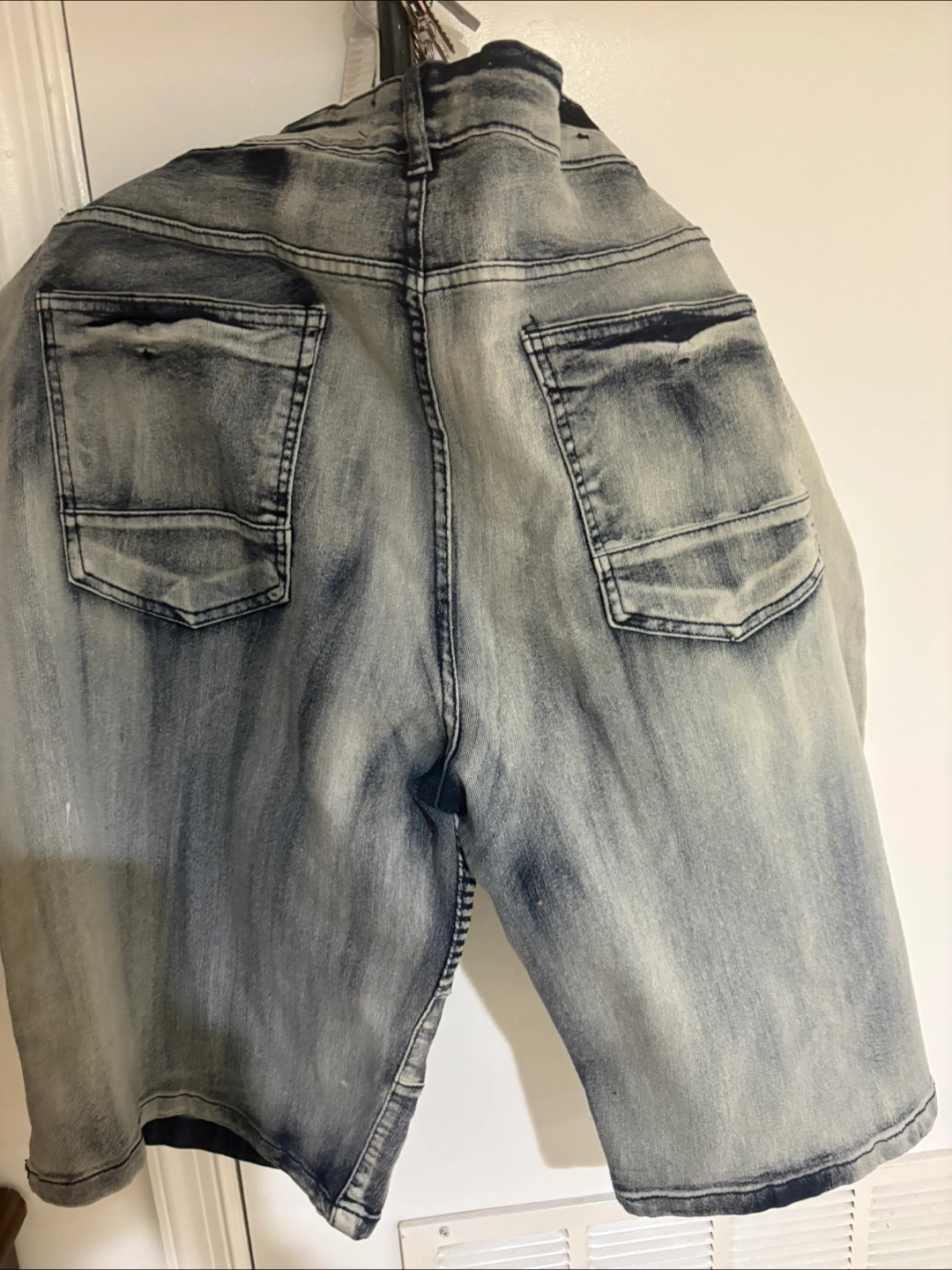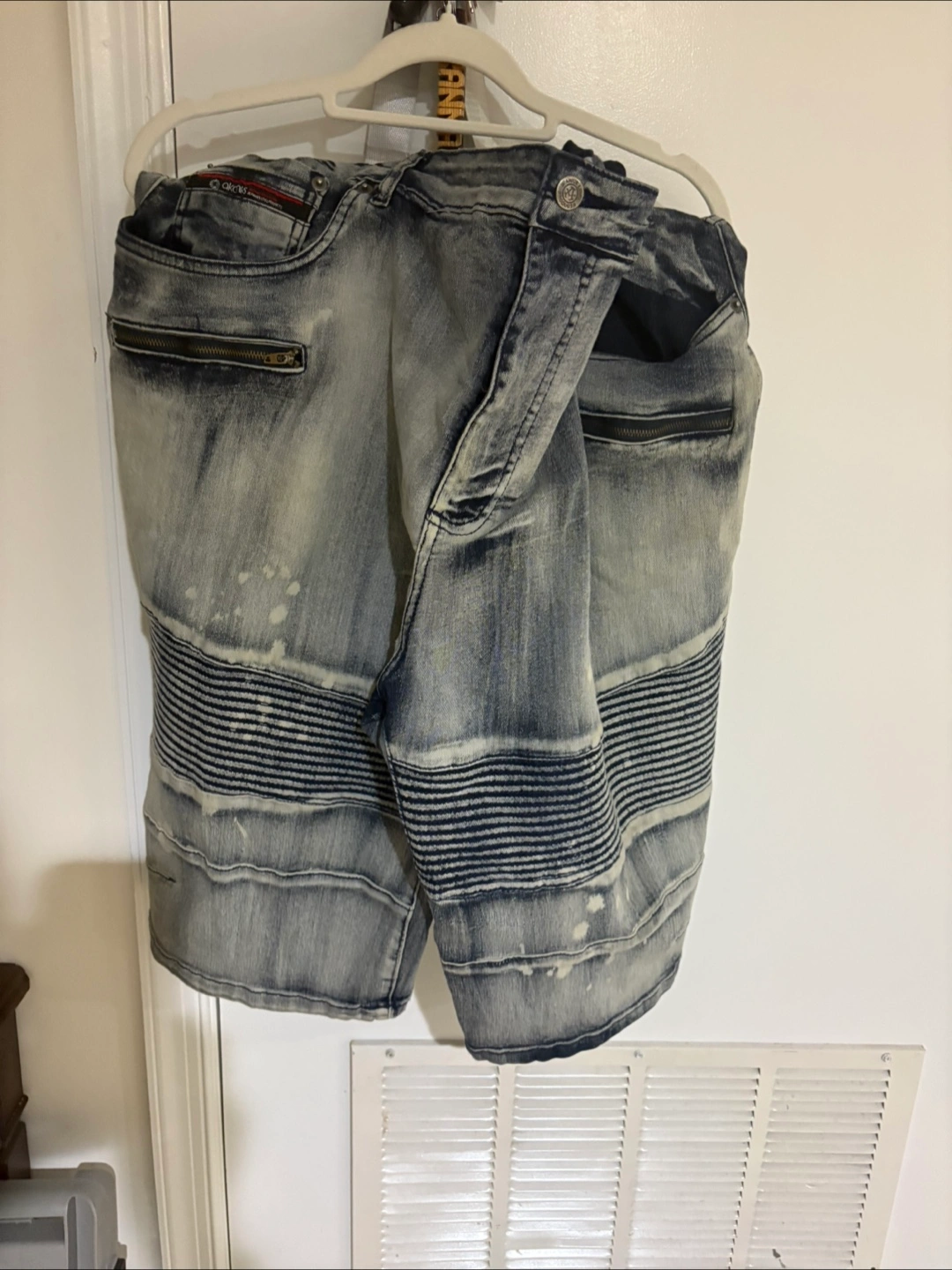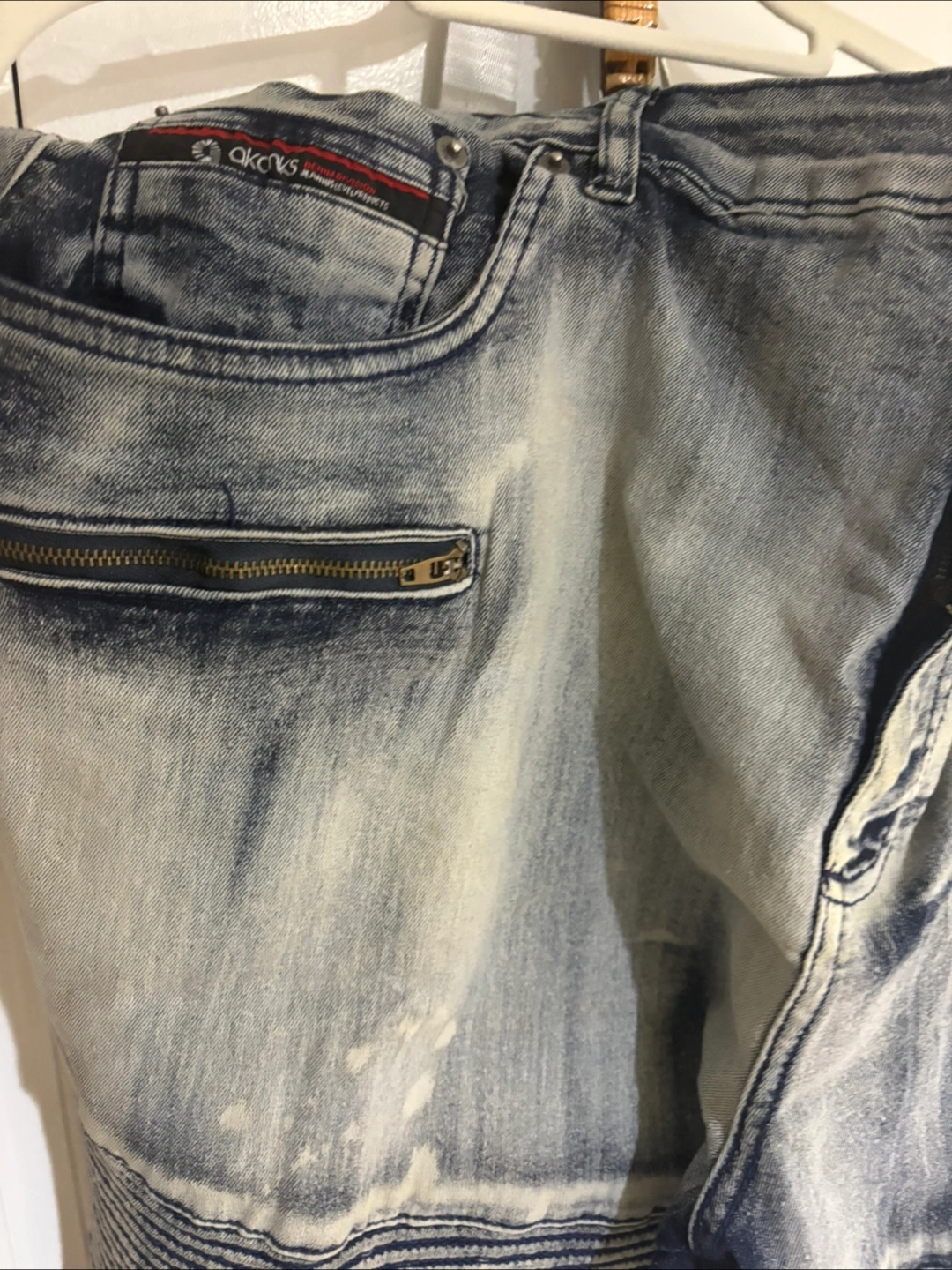 1000+Giving away a pair of AKOO denim shorts, size 46. They feature a light wash and a zipper pocket detail on the front. Great for casual wear!