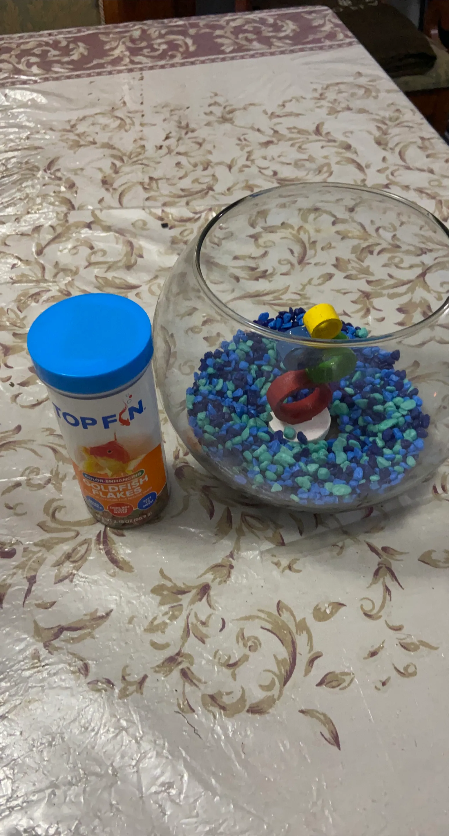 Selling a fish bowl, complete with colourful gravel and some decorative pieces! Also included is a container of Top Fin colour-enhancing goldfish flakes to keep your little friends happy and healthy