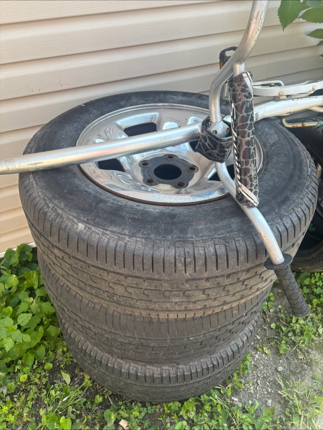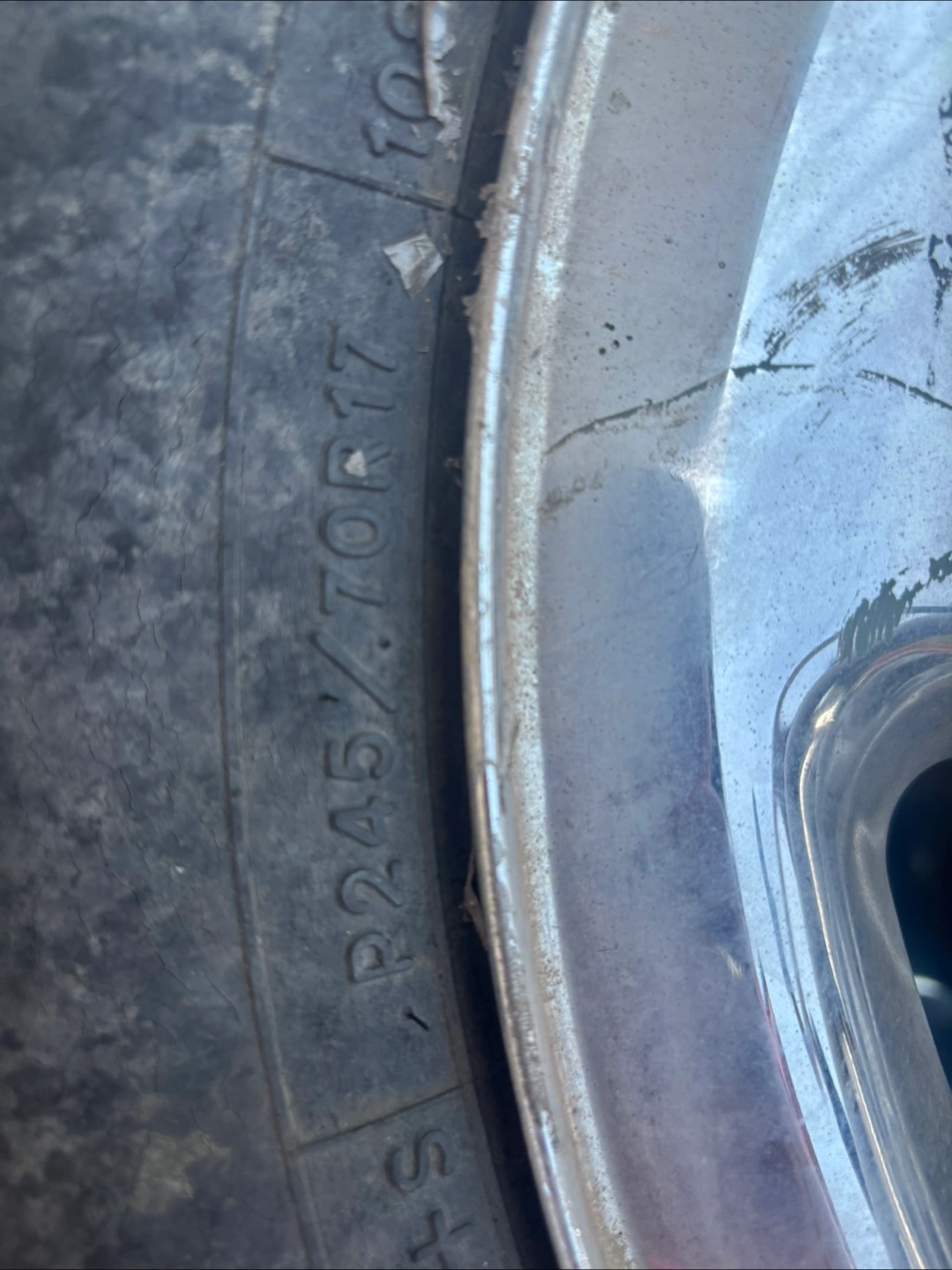 Selling a set of P245/70R17 tires with a wheel. The tire size is visible in the photos, and the wheel has a chrome finish. Great for a spare or replacement! $52 each or $165 if you take all 4