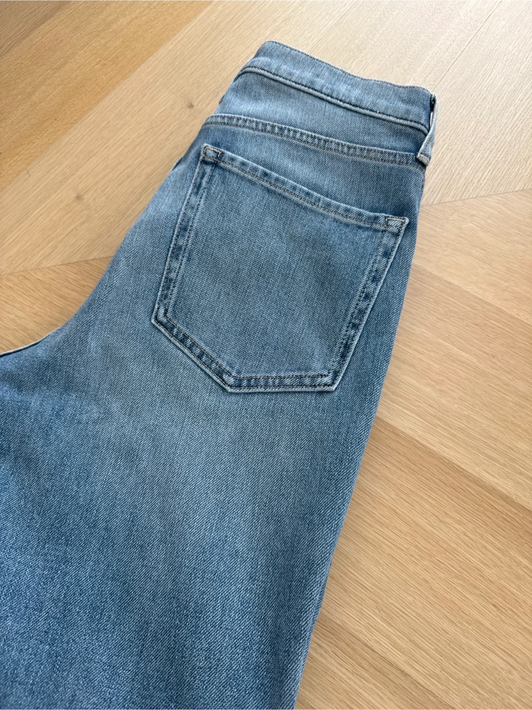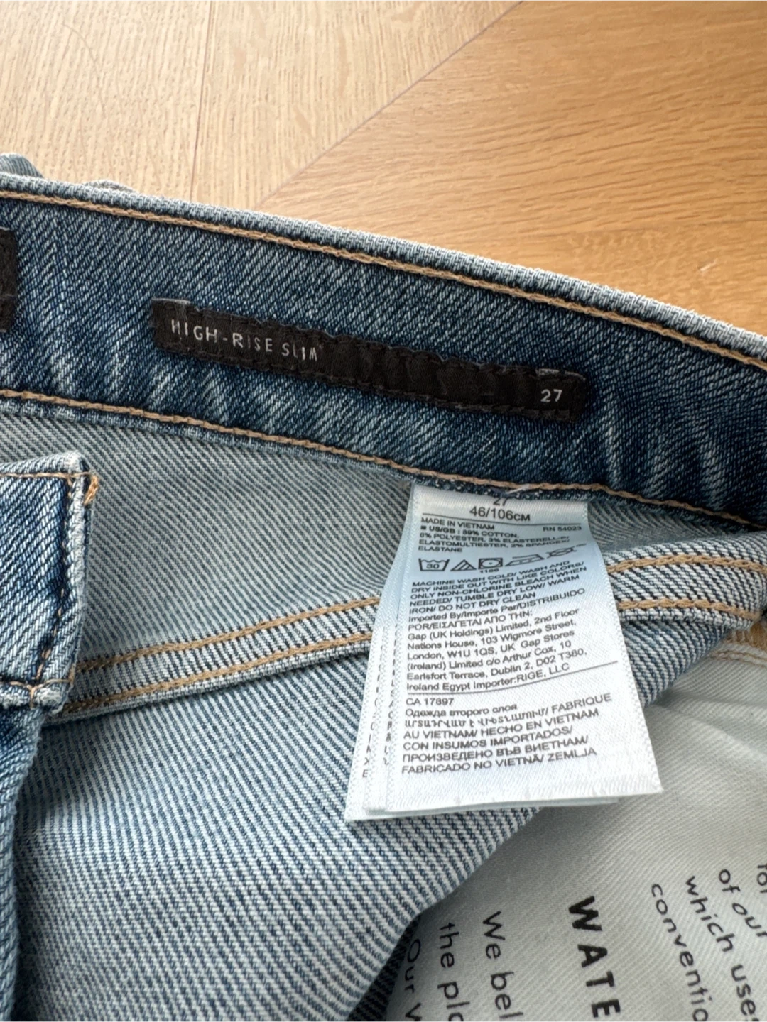 Selling a pair of Banana Republic high-rise slim jeans in size 27. These jeans are made with the Washwell™ Program, which uses at least 20% less water than conventional wash methods. They're made in Vietnam from 89% cotton, 6% polyester, and a blend of other materials. Feel free to reach out if you're interested!