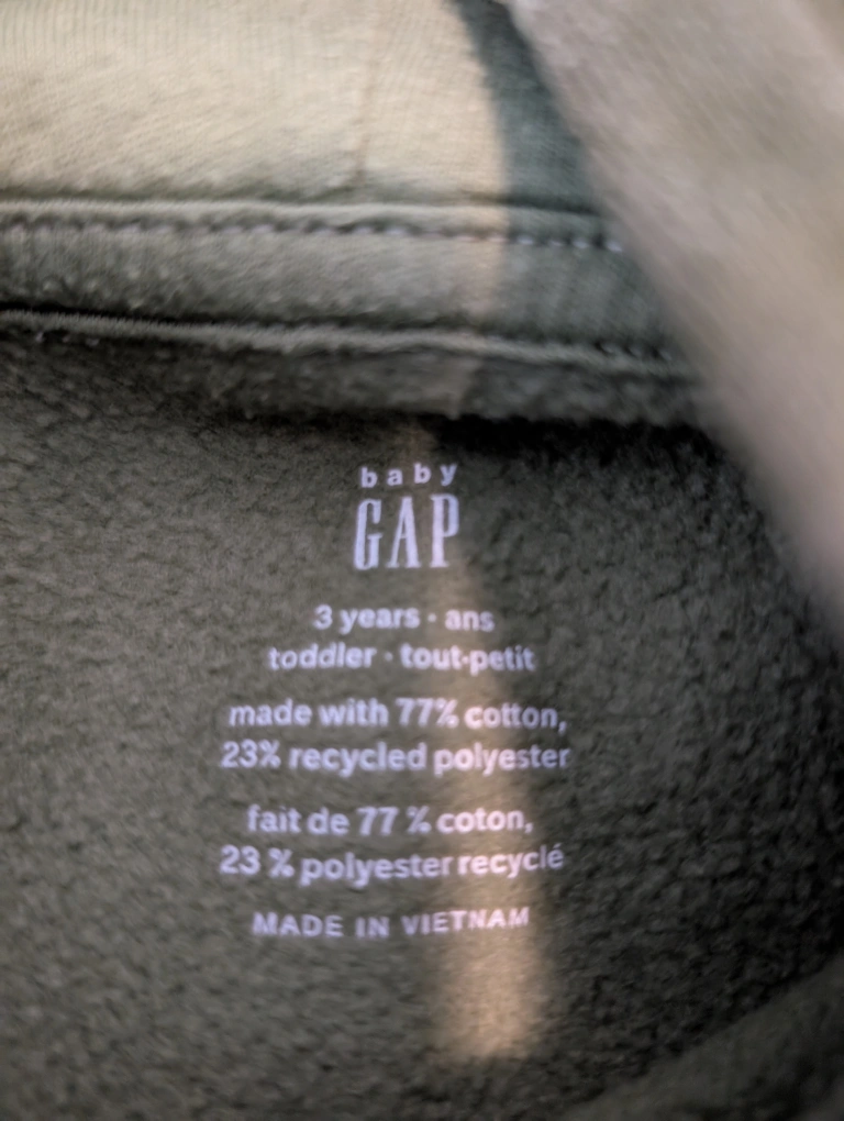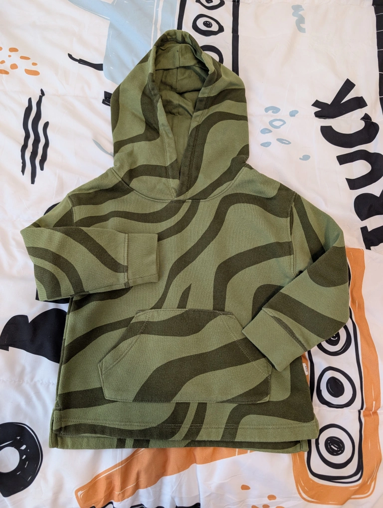 Selling a cute Baby Gap hoodie for toddlers! It's a size 3 years and has a fun, wavy pattern in shades of green. Made with 77% cotton and 23% recycled polyester, so it's comfy and eco-friendly.
