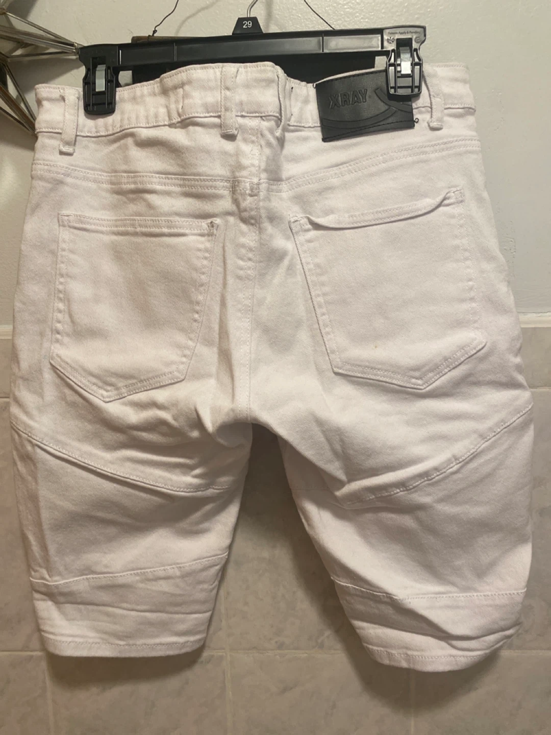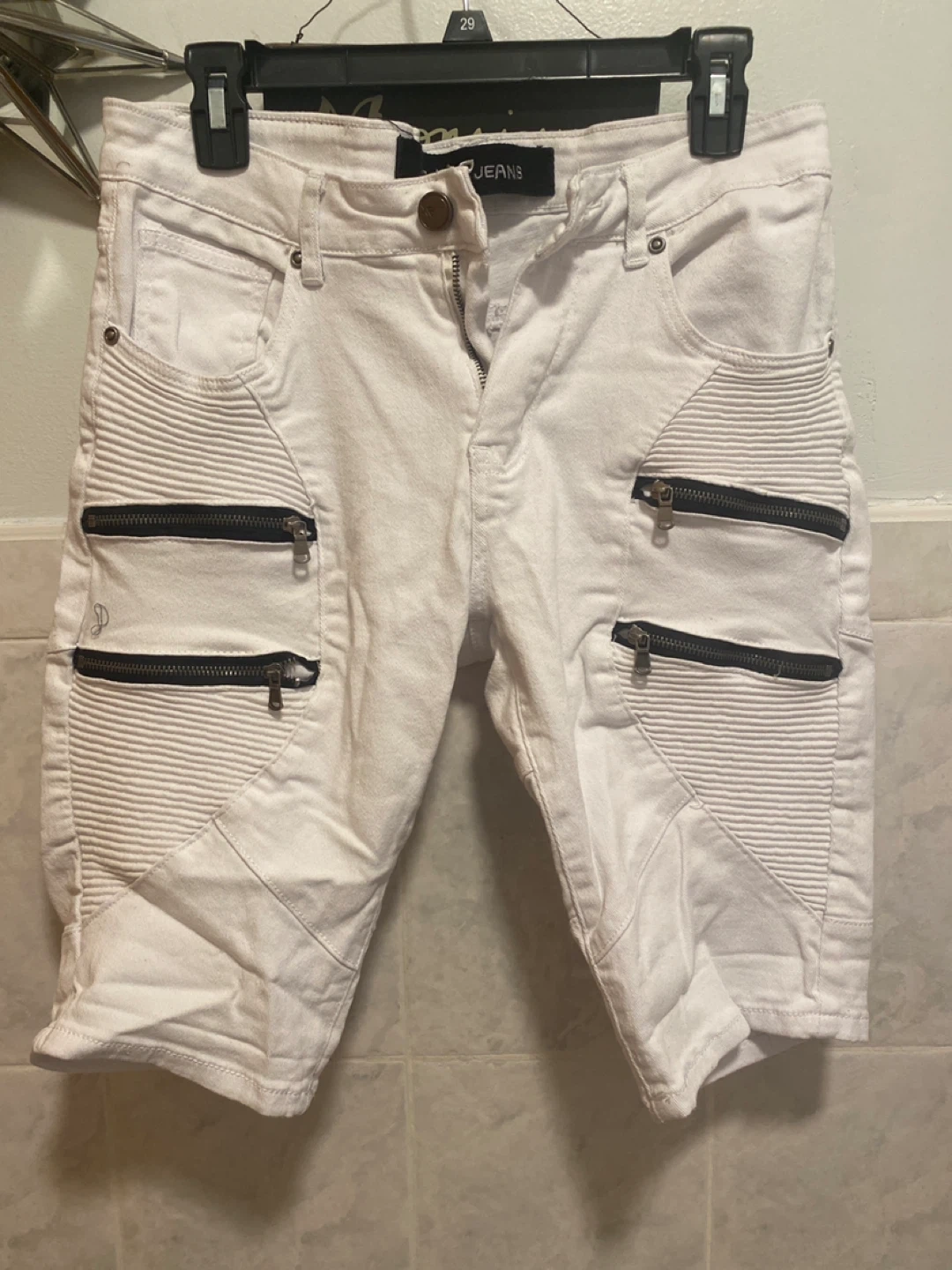 Selling a pair of white denim biker shorts from X-Ray Jeans. They have a cool biker-inspired design with zipper details. Great for a casual and edgy look!