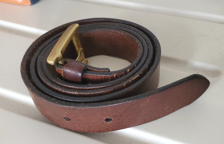 Selling a brown leather belt with a brass-colored buckle. It shows some signs of wear, but still has plenty of life left! It's a classic accessory that can be dressed up or down