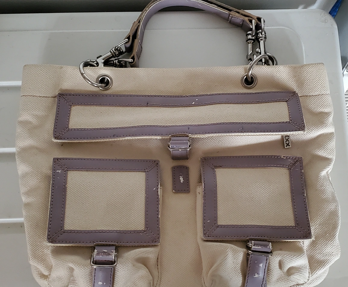 Selling a cream-colored canvas tote bag from XXI. It has a unique design with light purple accents and several pockets. The bag shows some signs of wear, as seen in the photos, but still has lots of life left!