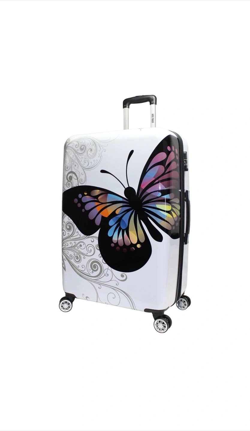 Selling a rolling suitcase featuring a beautiful butterfly design on a white background. It has a retractable handle and four wheels for easy maneuverability. Perfect for travel!