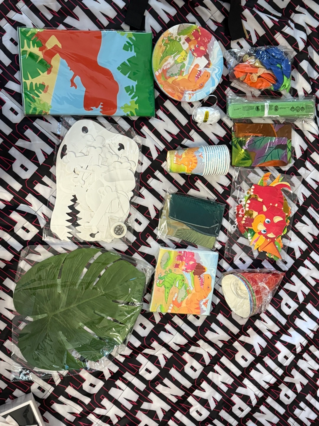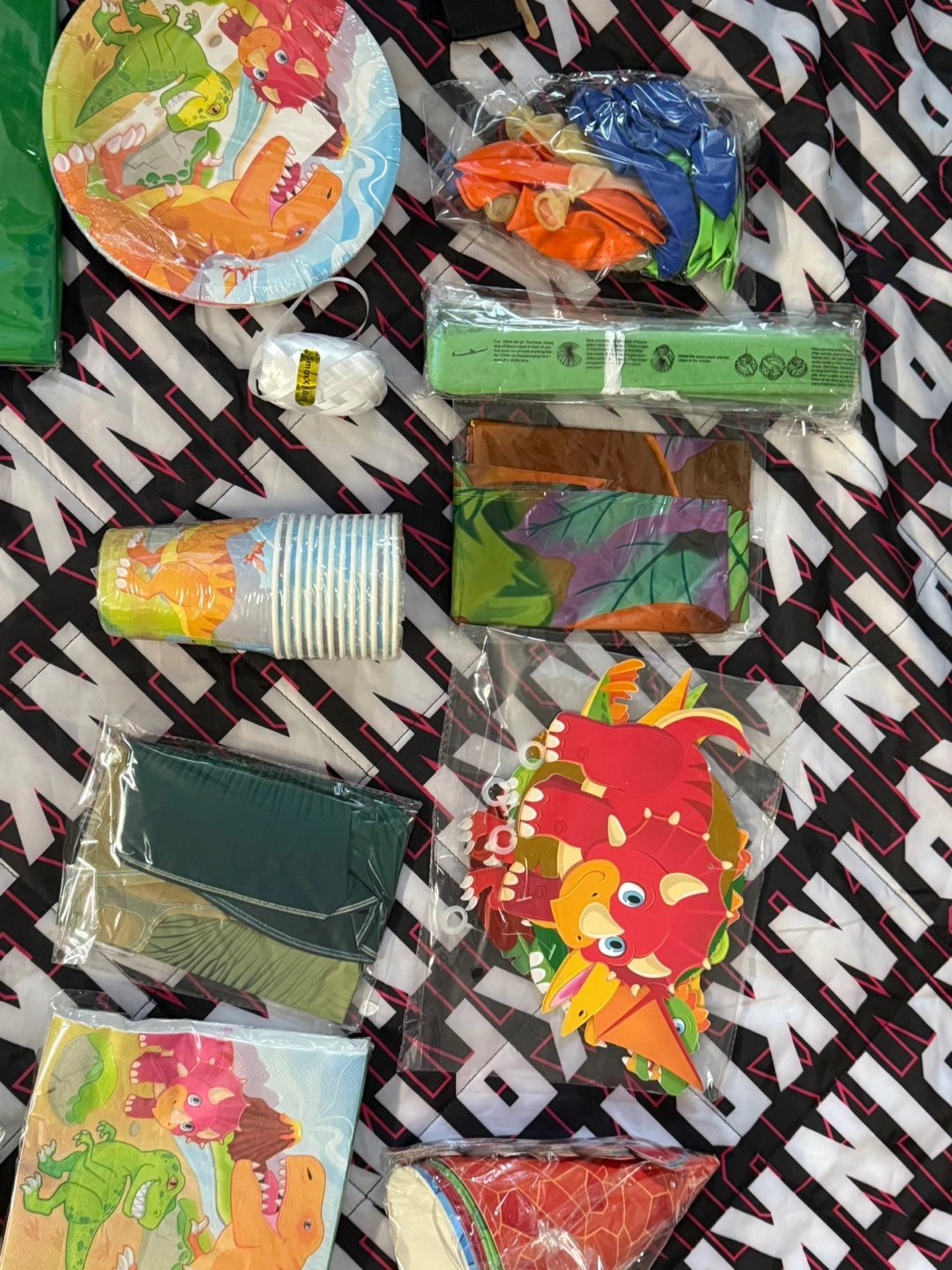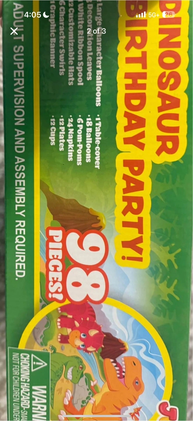 Get ready to roar with this fun dinosaur-themed birthday party kit! This set includes everything you need to throw a dino-mite celebration: - 18 Balloons - 6 Pom-Poms - 1 White Ribbon Spool - 2 Large Foil Balloons - 6 Character Swirls - 1 Graphic Banner - 1 Table Cover - 3 Decoration Leaves - 12 Customizable Hats - 24 Napkins - 12 Plates - 12 Cups With 98 pieces, you'll have plenty to make your little one's birthday extra special!