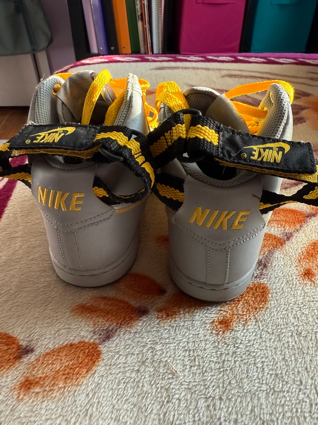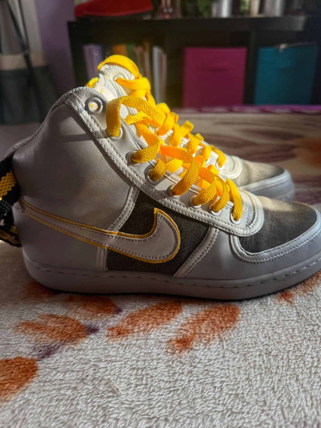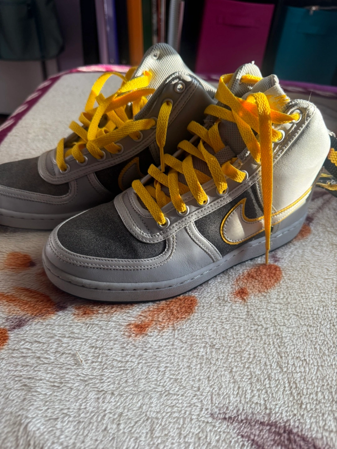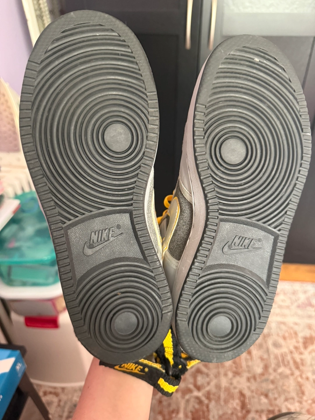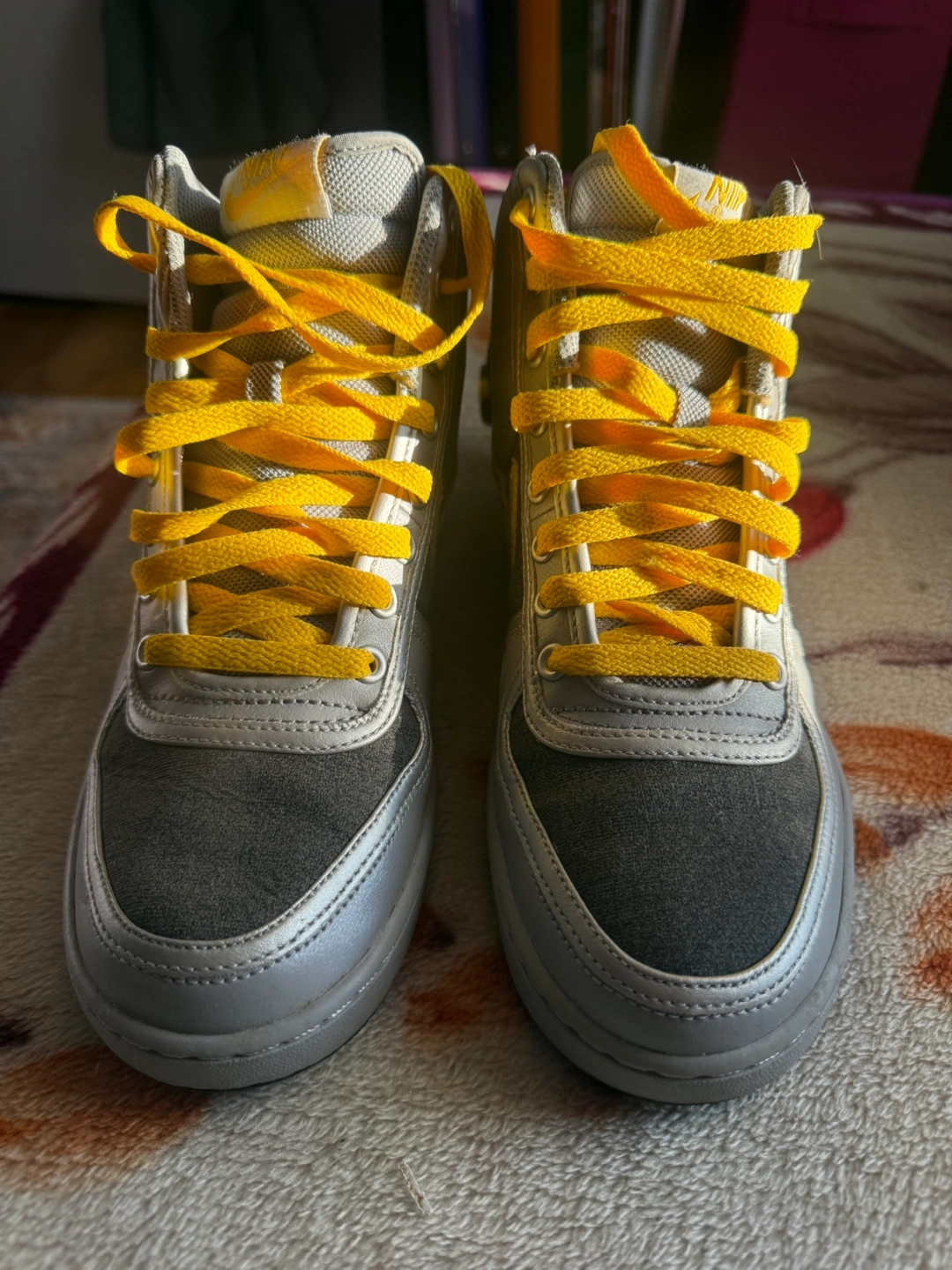65Selling a pair of Nike high top sneakers! They feature a cool gray and yellow color scheme and are in like new condition. Worn only once. Perfect for adding a pop of color to your outfit!