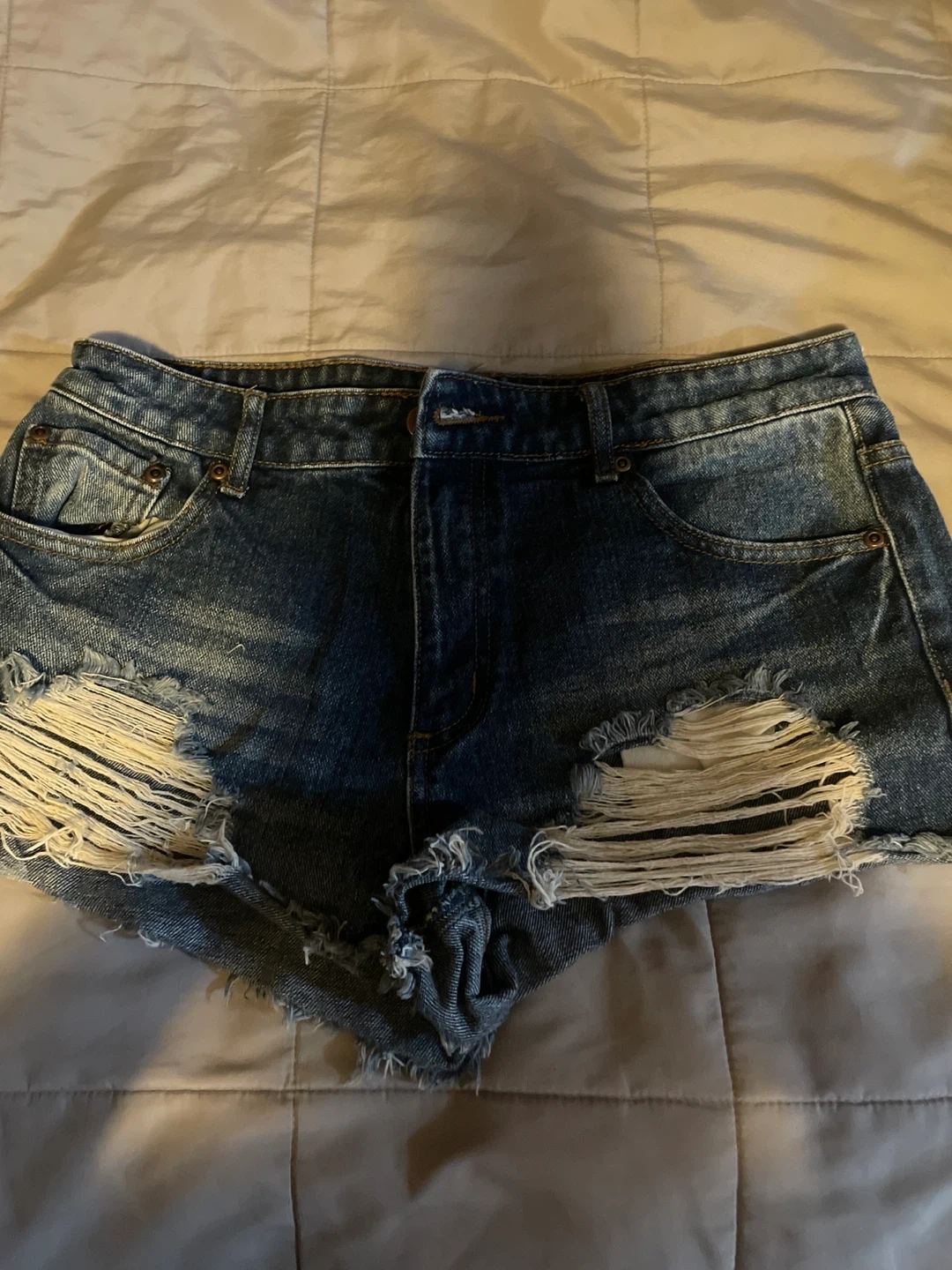 629Selling a pair of Forever 21 distressed denim shorts. They are a size 28 and feature a stylish, worn look with frayed detailing. Perfect for a casual, trendy outfit!