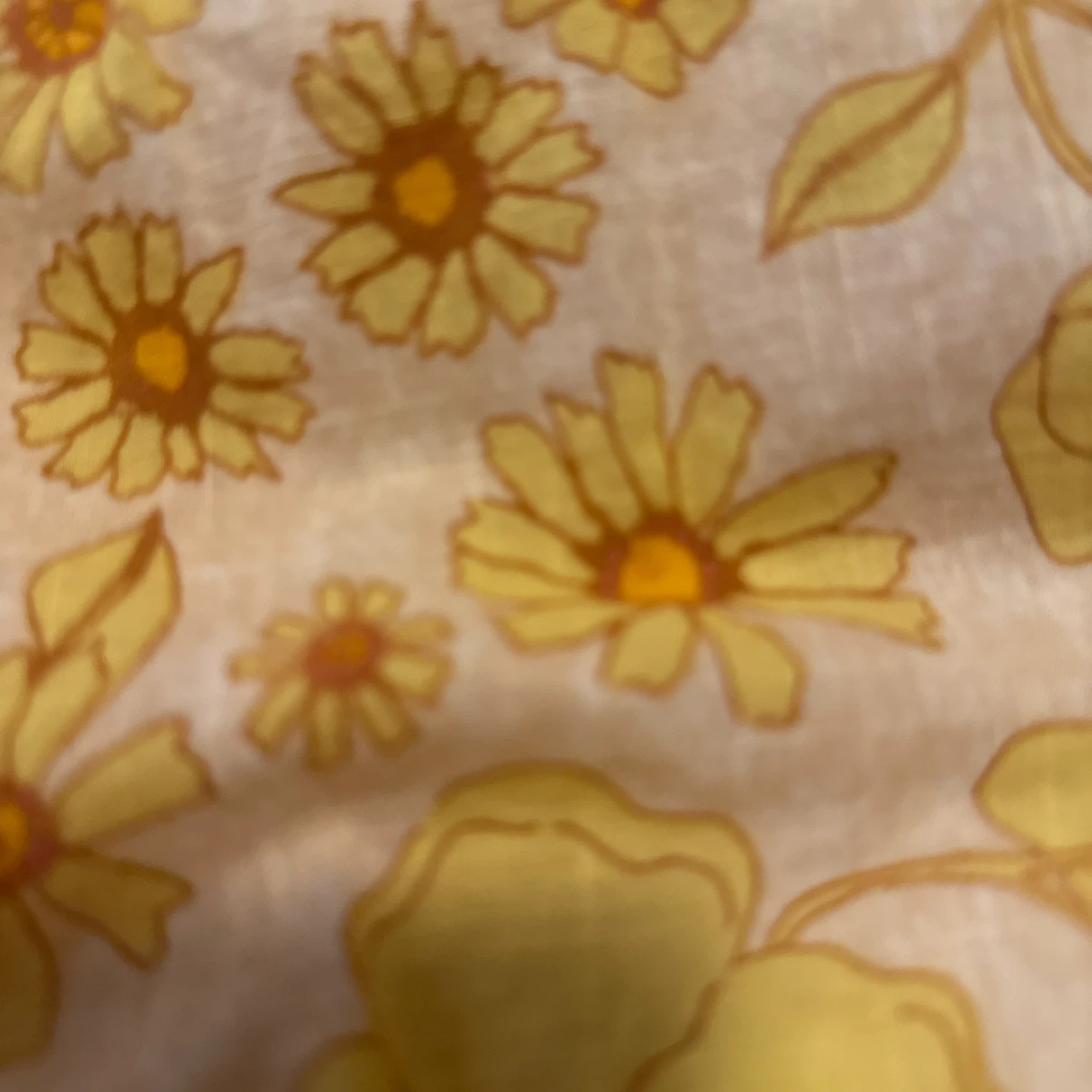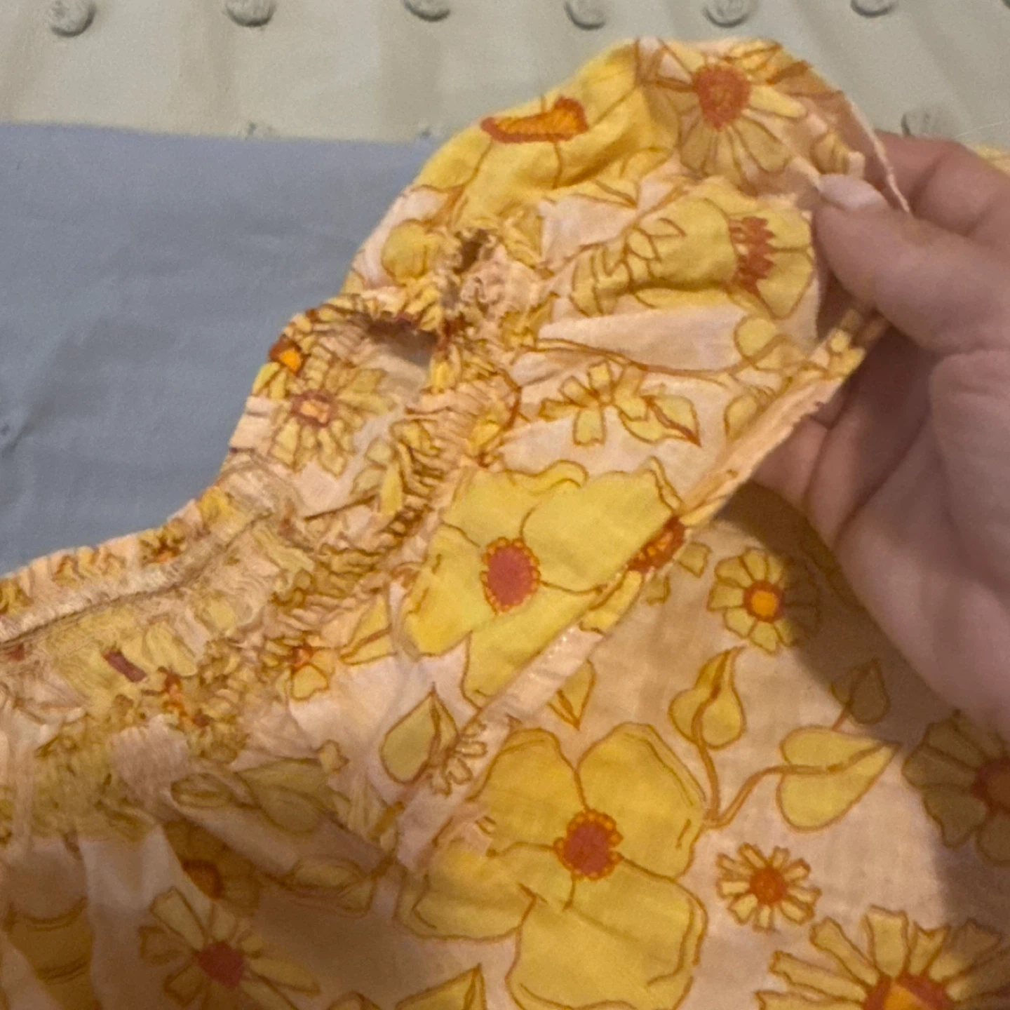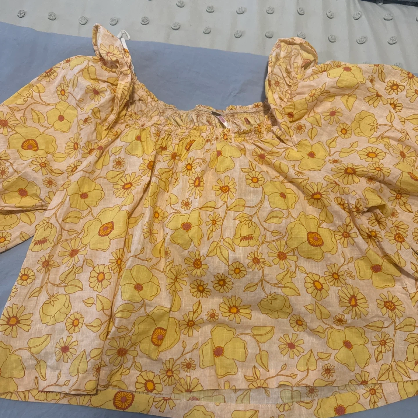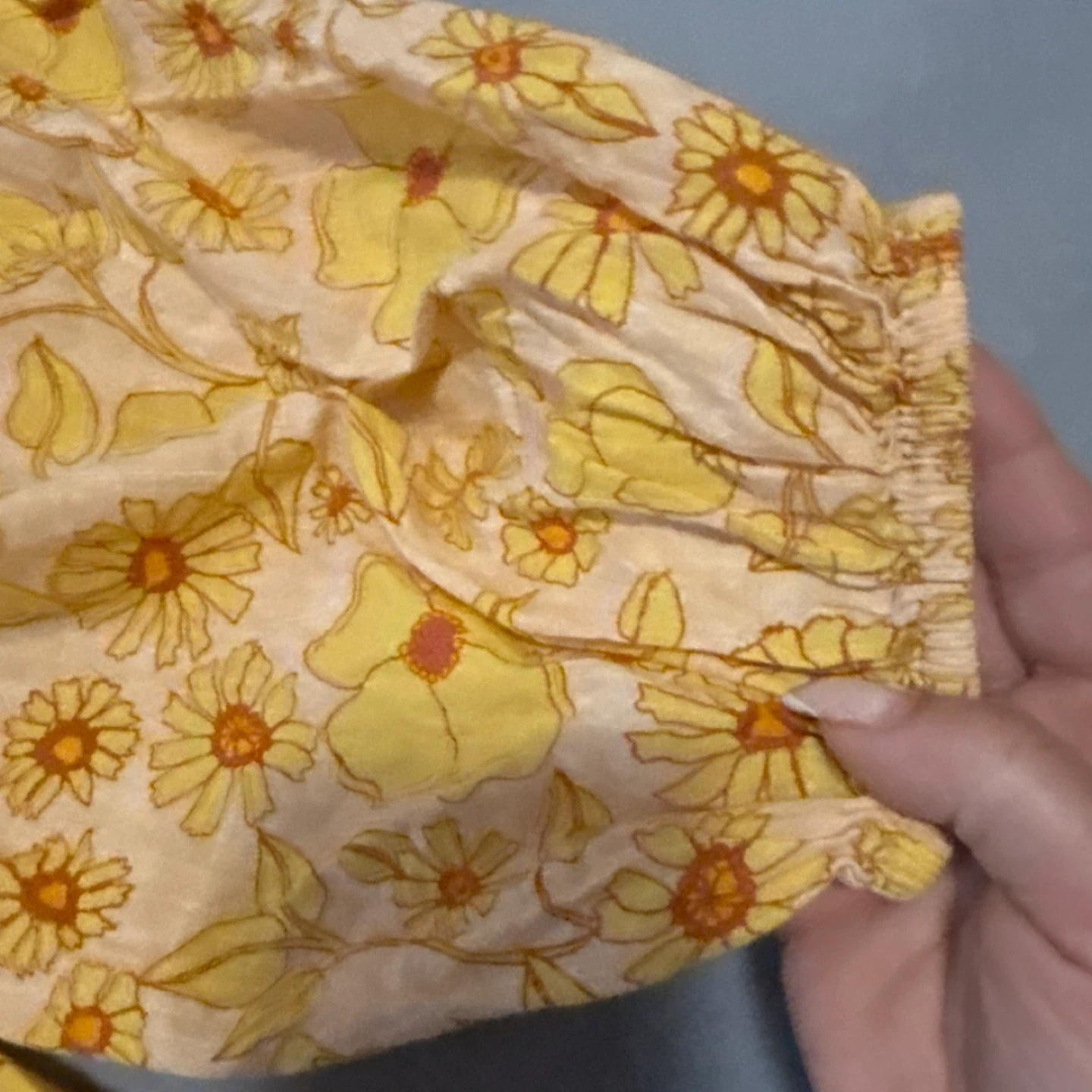 17This is a cute blouse with a yellow floral print. It has a ruffled neckline and sleeves. Perfect for a sunny day! Large free people