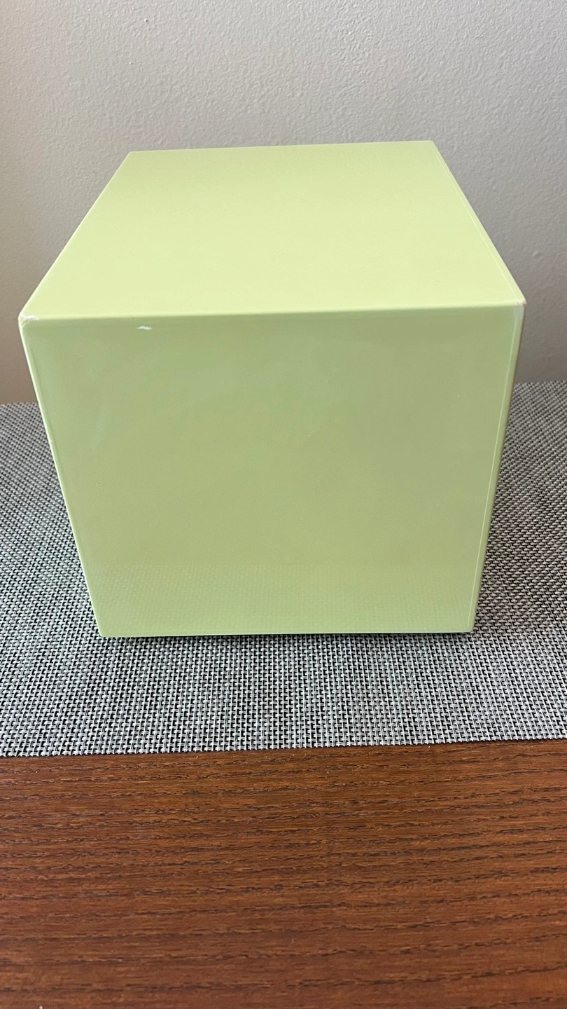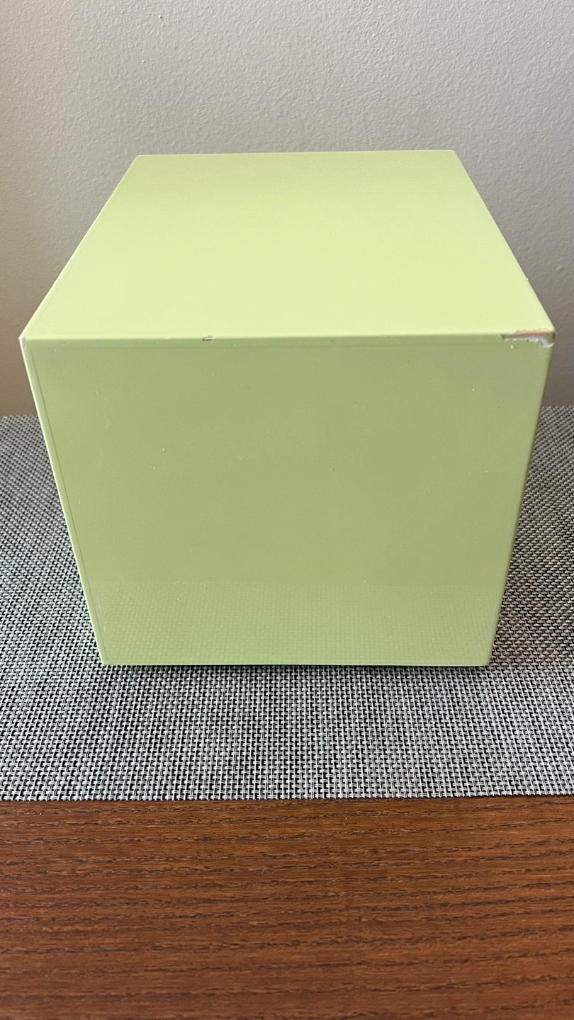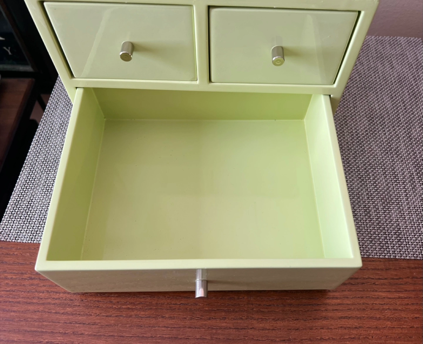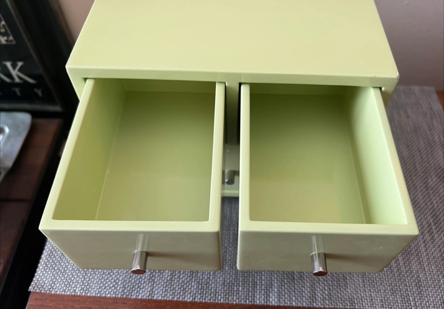 Used - in good condition. Clearing out my storage and no longer need. From the late 90s. Pale/tea green lacquered wooden vanity/jewelry box. 2 top drawers and one wide bottom drawer - all with silver drawer pulls. **Signs of wear/chipped lacquer on the upper corners (see photos) - can easily be touched up! Otherwise in great condition - sturdy, quality piece. Dimensions: 9.25” L x 7” D x 6.25” H Pick up only near Astoria Park, Queens NYC 11102 Only Cash (preferred) or Venmo for payment Check out my other listings!