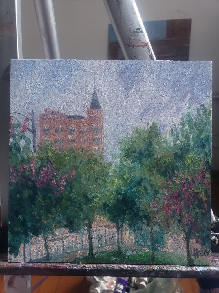 Plein air painting of the Robey Hotel in Chicago. 6x6" oil on panel