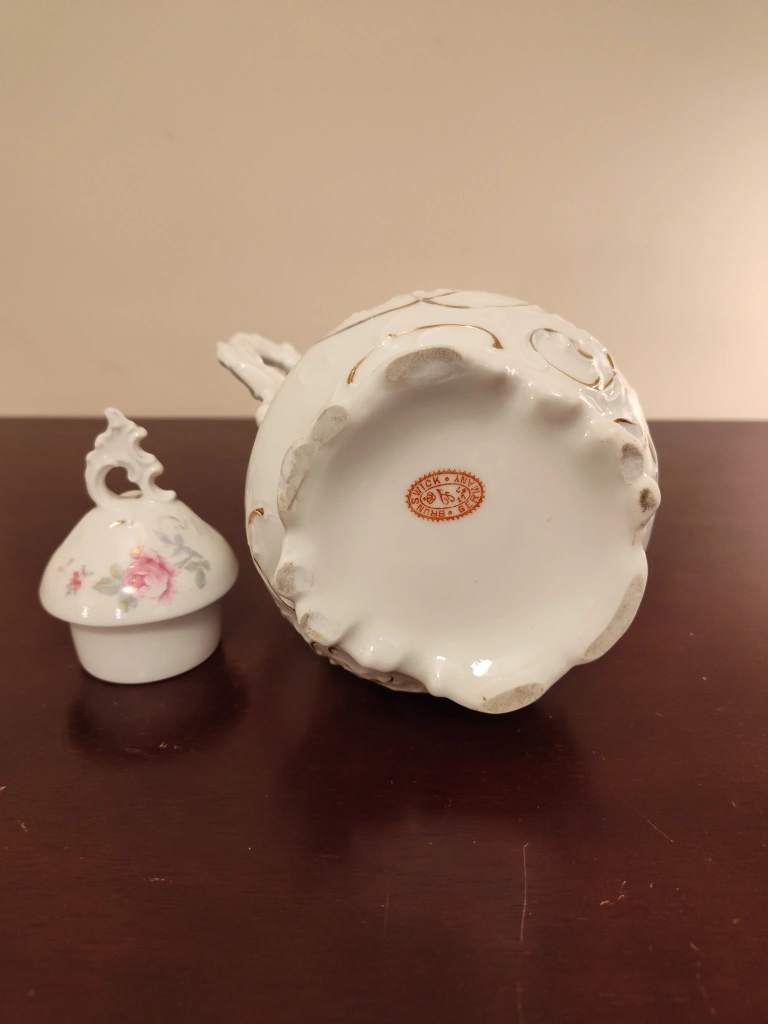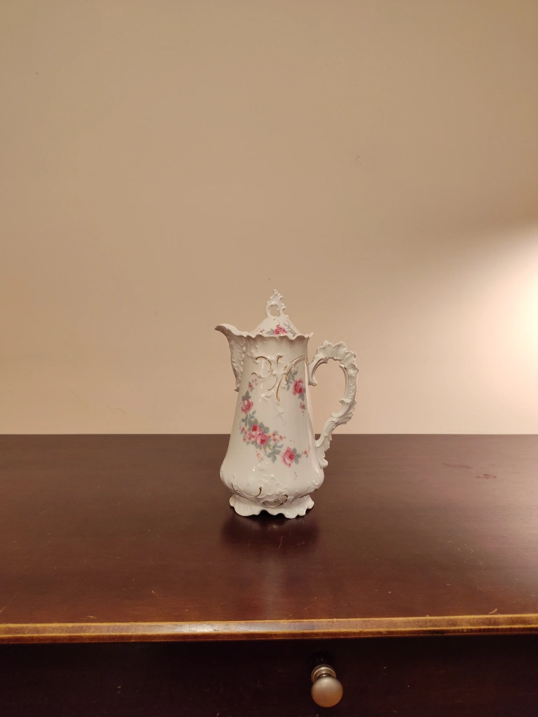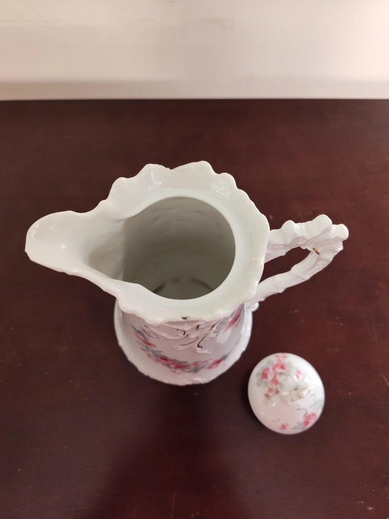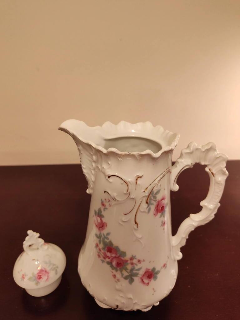 Selling a beautiful vintage Victoria Carlsbad Austria pitcher! It features a delicate floral design with pink roses and gold accents. It comes with a lid and is in very good condition for its age. Small chip on the lip (can see it in the photos). Vintage collector's item. Perfect for adding a touch of elegance to your home!