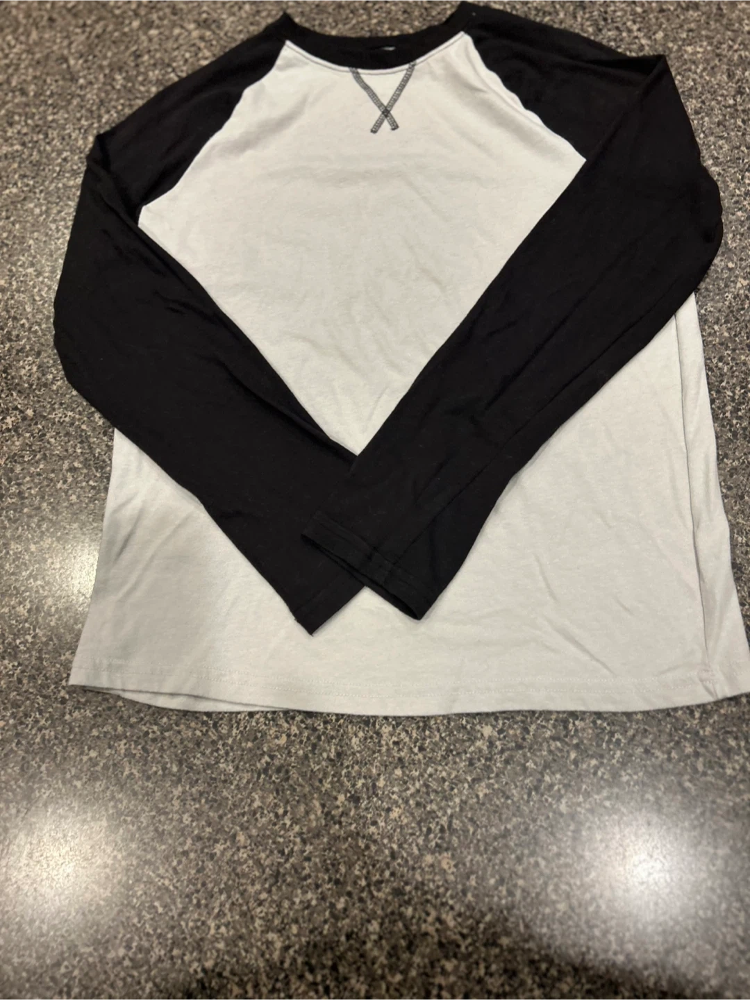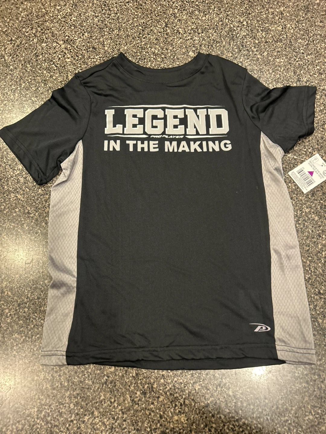 Two boys' shirts are up for grabs! One is a long-sleeved raglan tee in black and gray. The other is a short-sleeved black and gray athletic tee with "Legend in the Making" printed on the front. Both are in great condition and ready for a new home