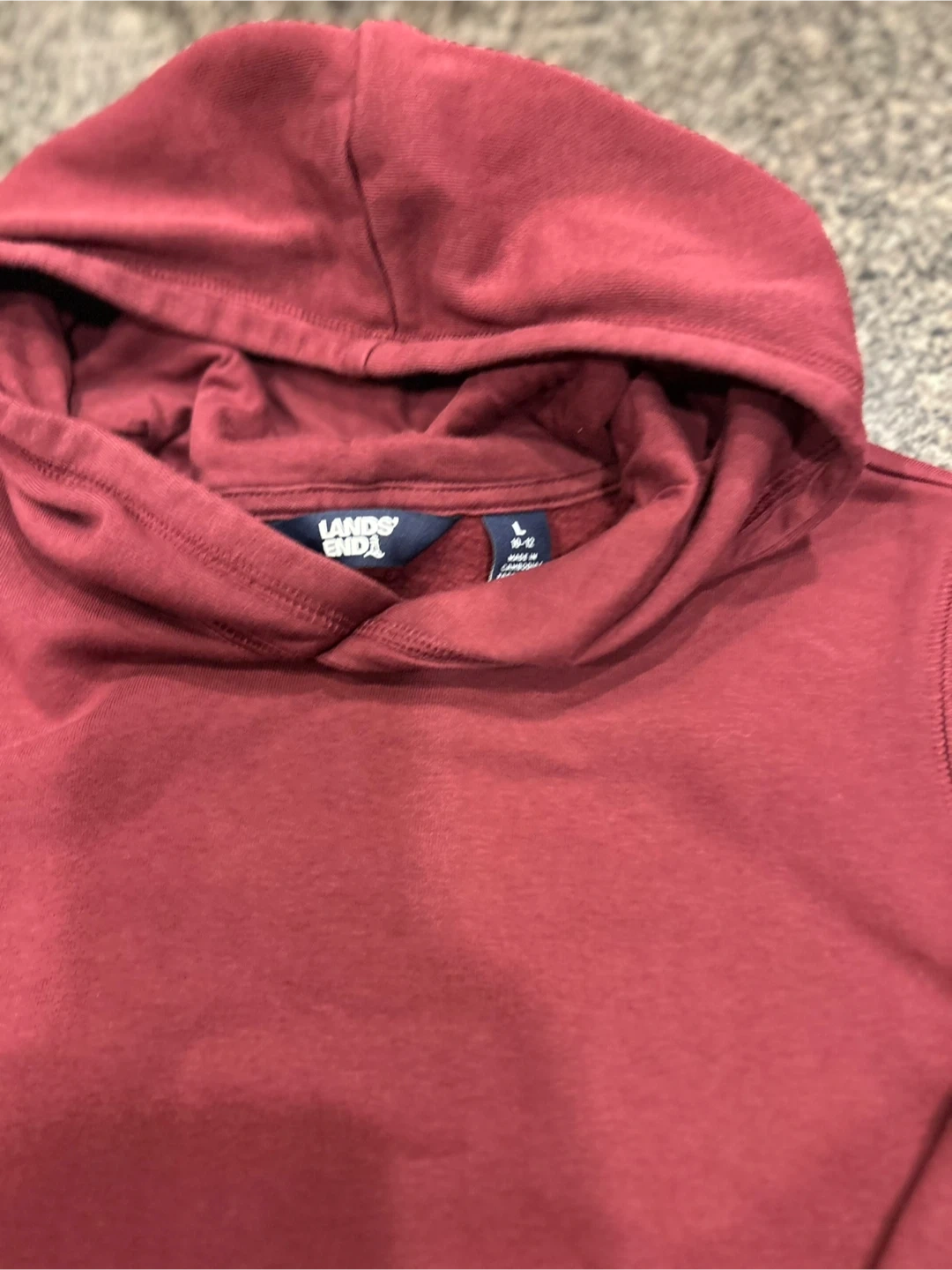 NWT Selling a Lands' End maroon hoodie in size L (10-12). It's in great condition and ready for a new home! Perfect for keeping cozy on cooler days.