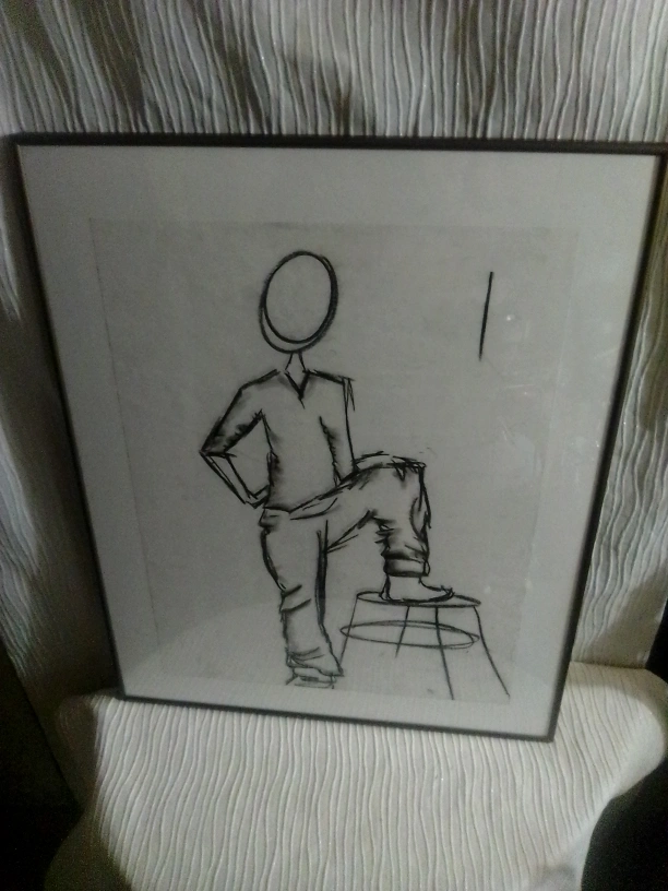 Framed artwork depicting a figure study. The piece features a minimalist line drawing of a person. The frame is black. 29x23x1