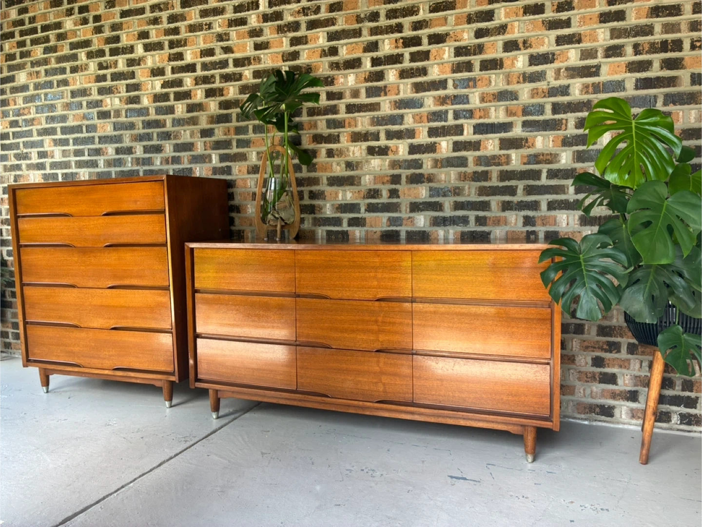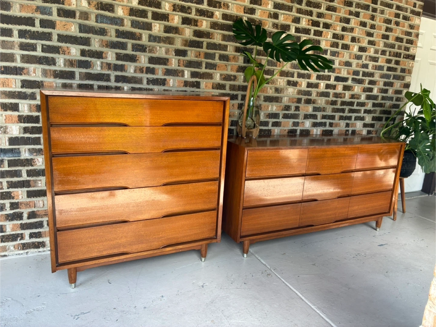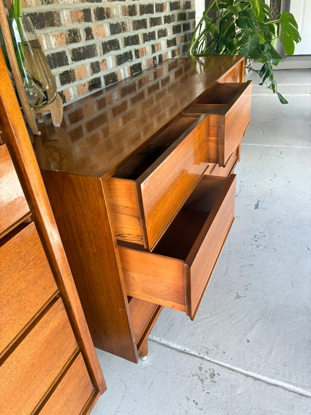 83MCM dresser set . Low dresser 9 drawers and tall dresser . Has minor nicks and stains due to age and moving other than that in great vintage condition. Pick in in Burbank. Hold only with small deposit of $20 Rest cash $ 1250 price to sell ‼️ Low dresser 62” x 32” x 19” Tall dresser 44” x 40” w x 19”