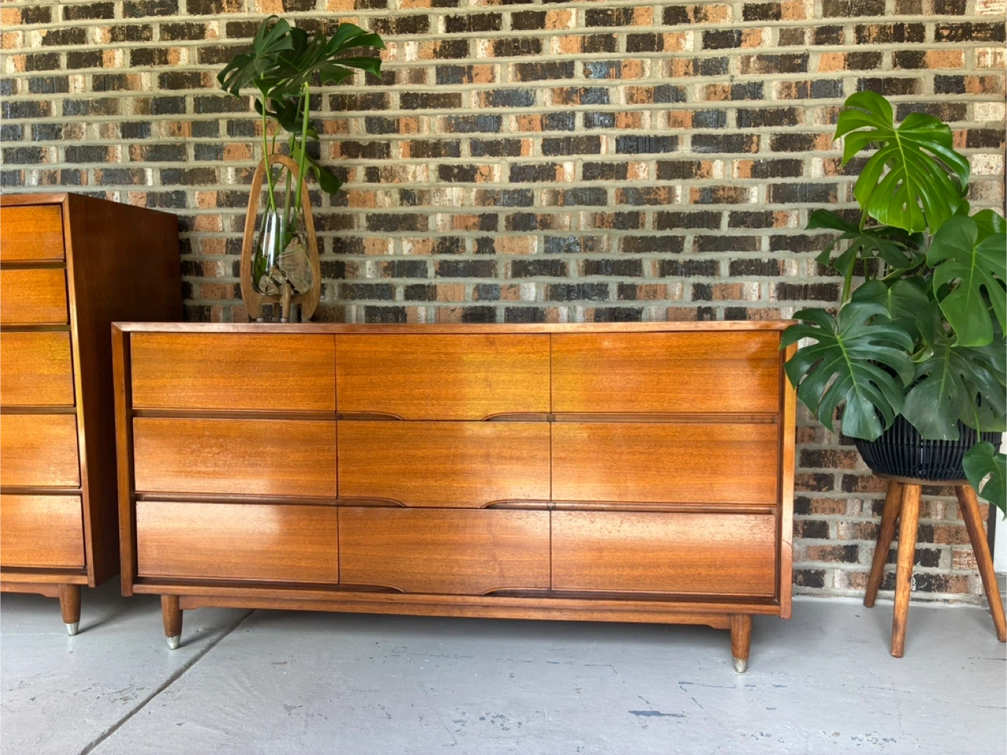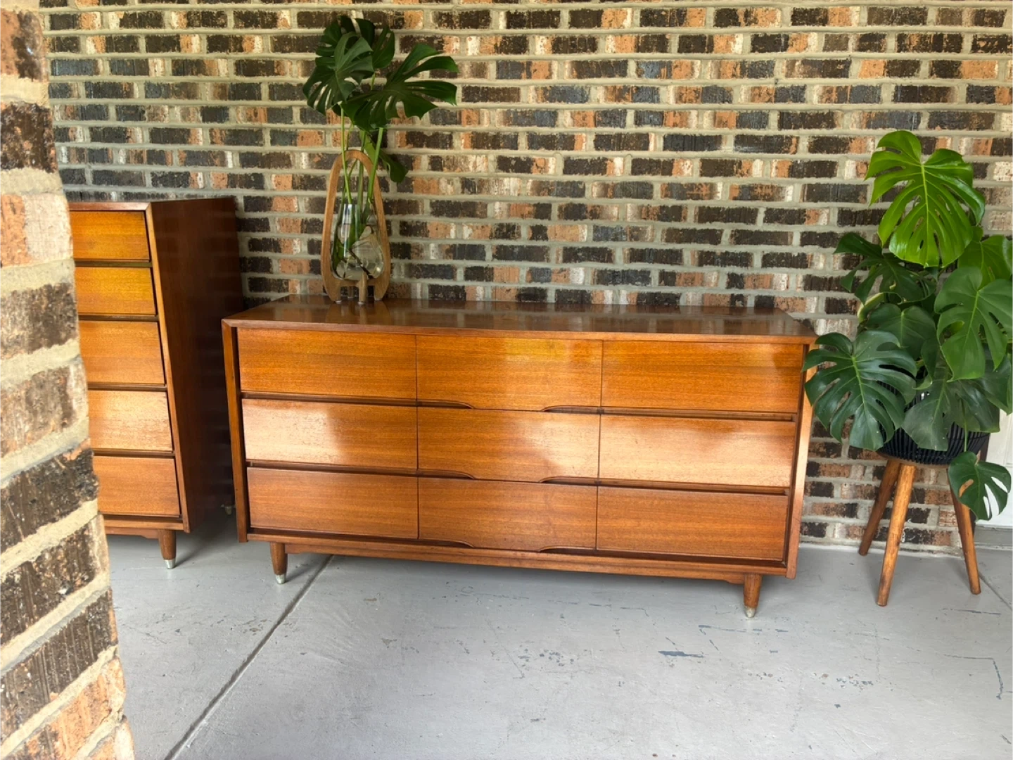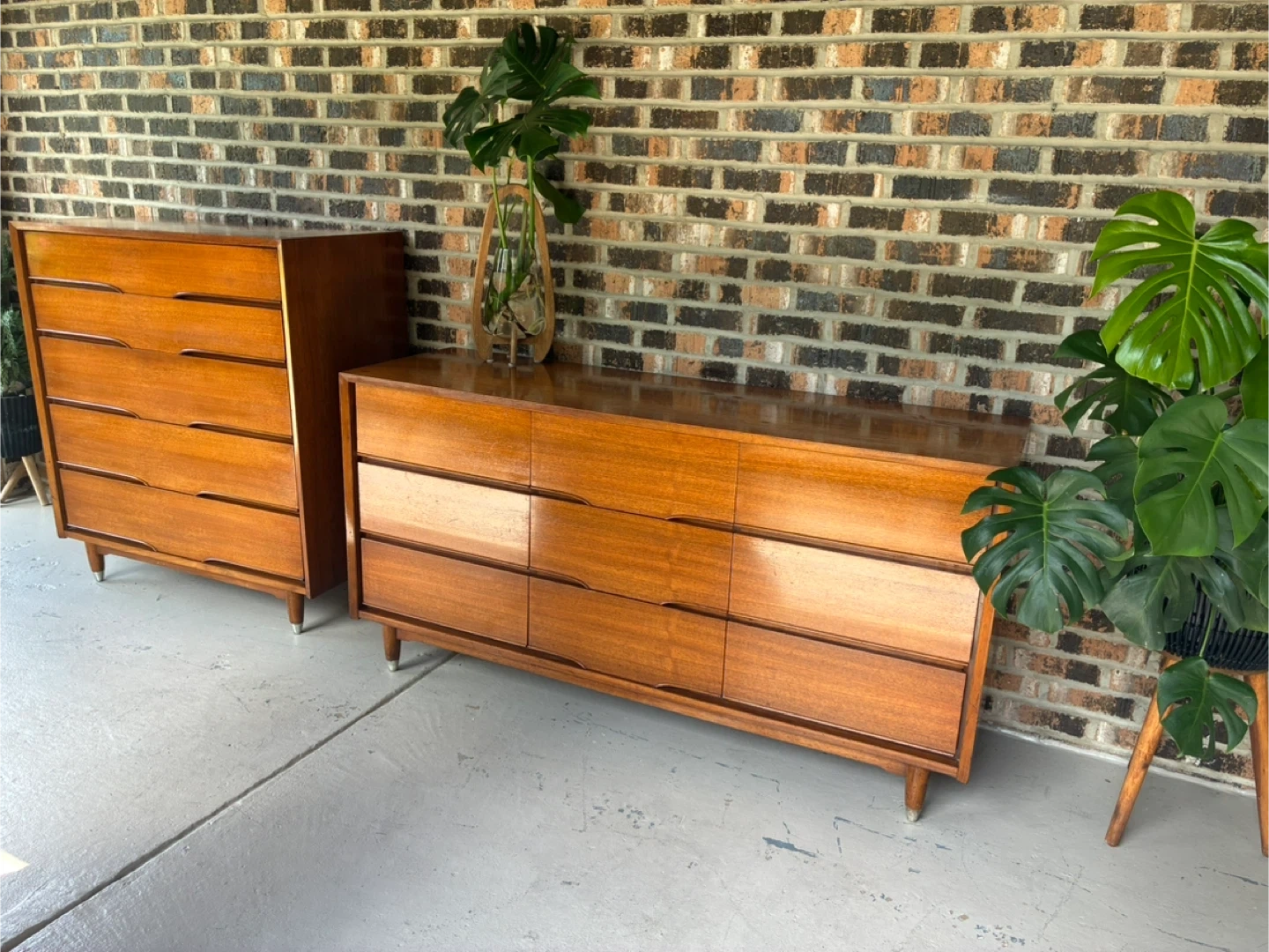 83MCM dresser set . Low dresser 9 drawers and tall dresser . Has minor nicks and stains due to age and moving other than that in great vintage condition. Pick in in Burbank. Hold only with small deposit of $20 Rest cash $ 1250 price to sell ‼️ Low dresser 62” x 32” x 19” Tall dresser 44” x 40” w x 19”