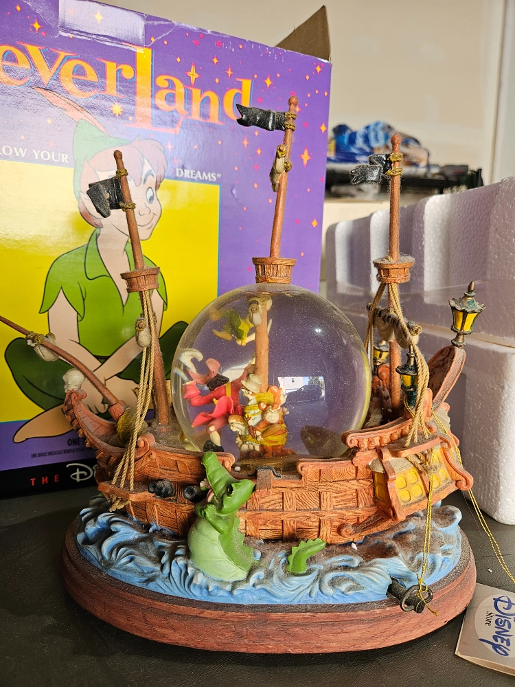 This is a Disney Store musical snow globe featuring Peter Pan. It's in the shape of a pirate ship sailing on waves. The snow globe is in good condition. It comes with its original box.