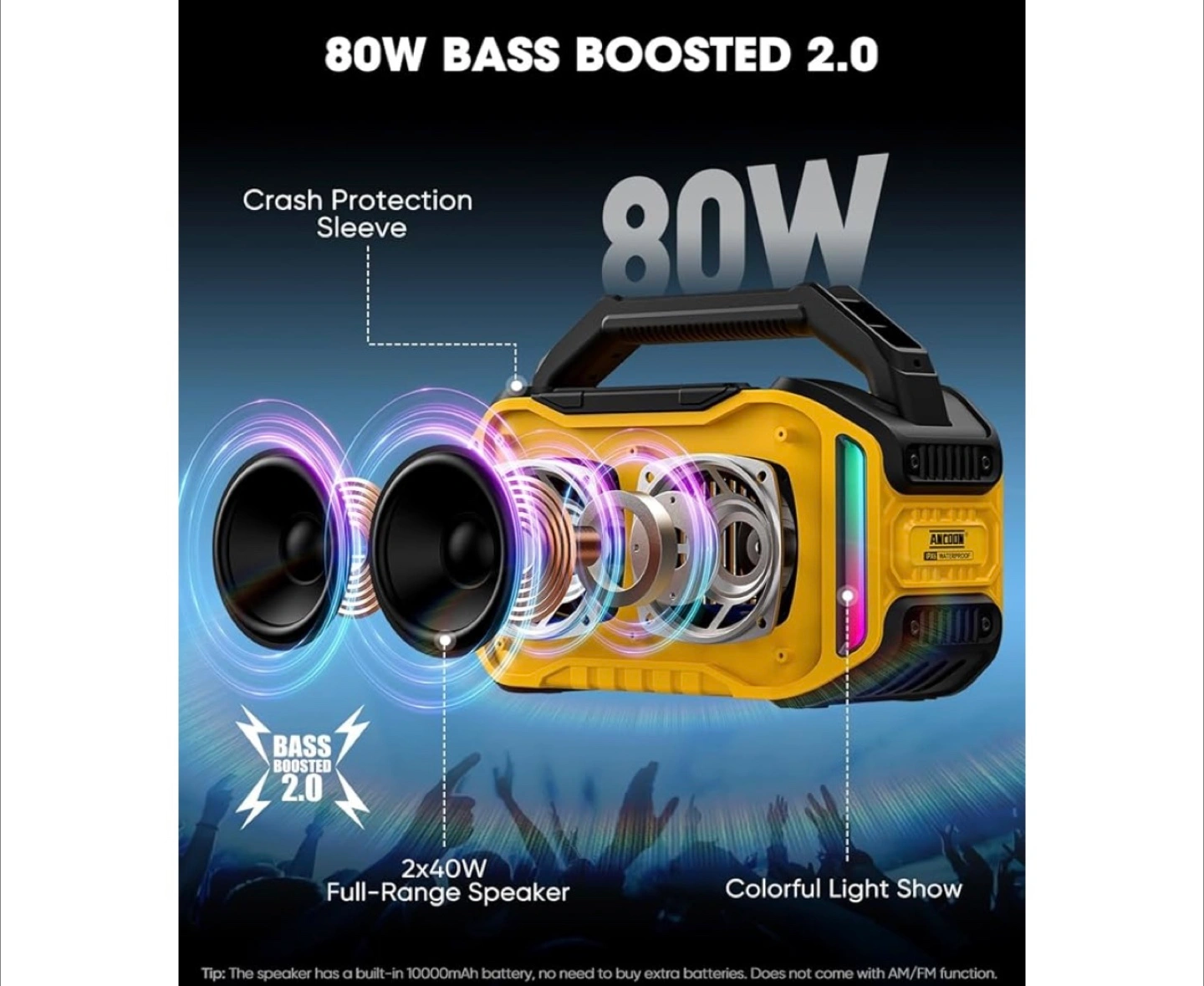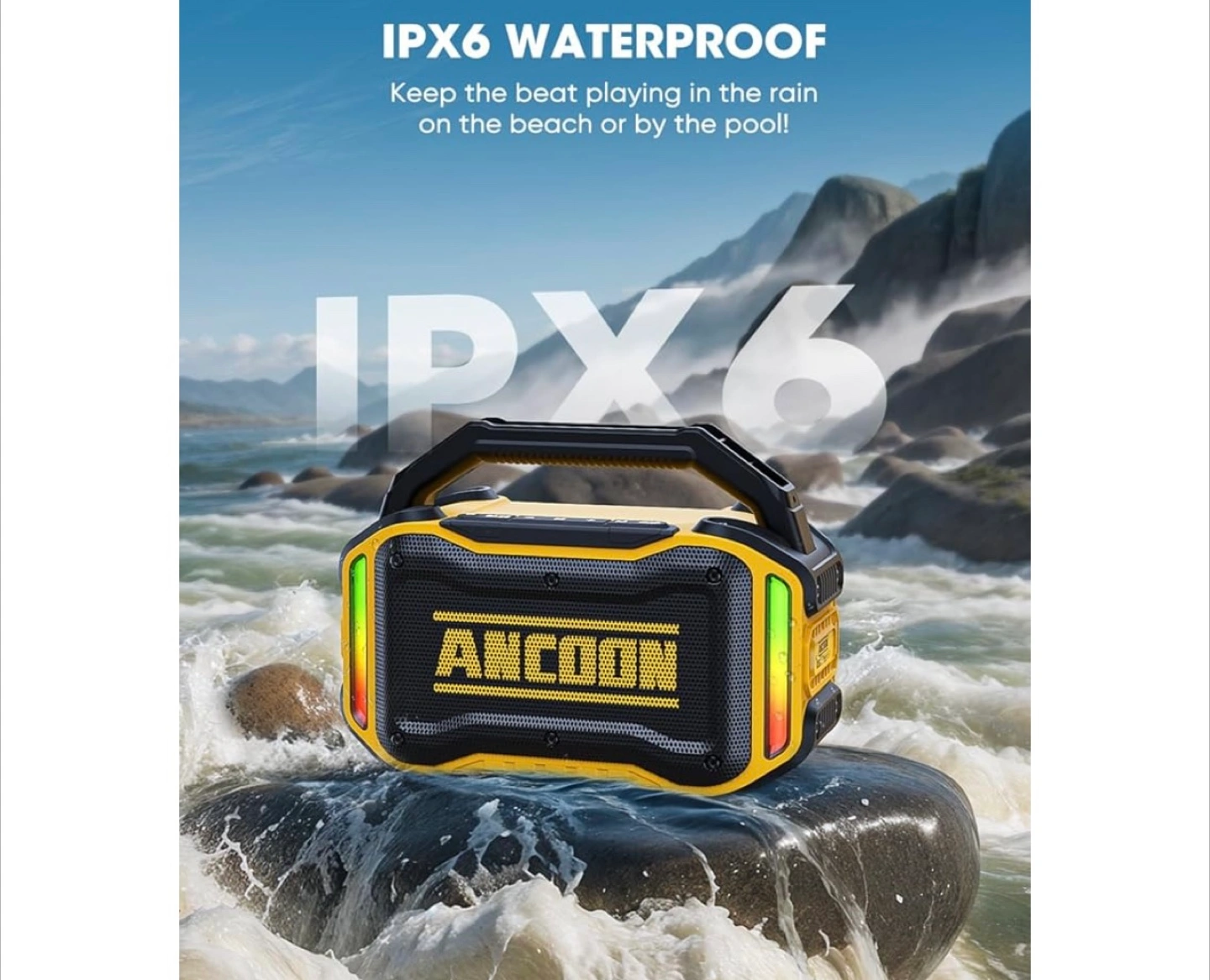 This ANCOON speaker is perfect for outdoor adventures! It's IPX6 waterproof, so you can keep the beat playing in the rain, on the beach, or by the pool. Key features: - 80W Bass Boosted 2.0 audio - Crash Protection Sleeve - 2x40W Full-Range Speakers - Colorful Light Show