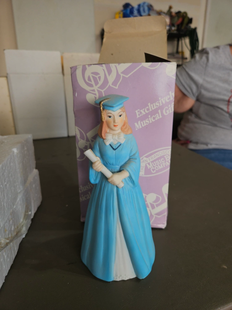 I'm selling a San Francisco Music Box Company musical figurine. This figurine is of a graduate in a light blue gown holding a diploma. The figurine comes with its original box.