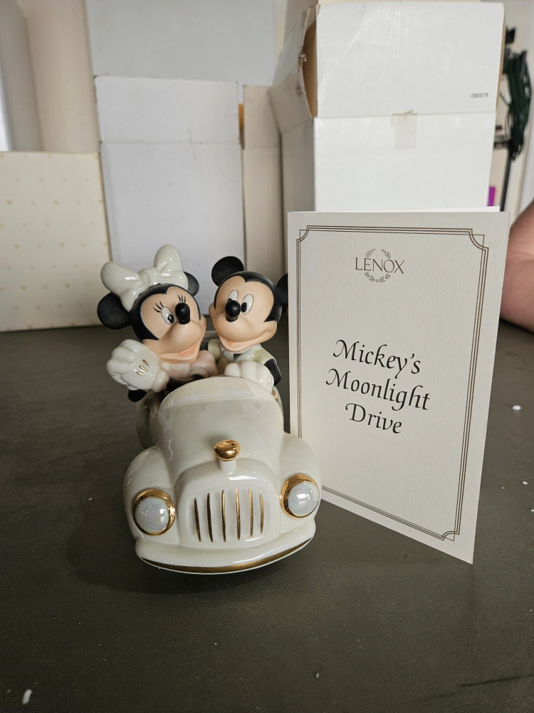 Selling a charming Lenox Mickey's Moonlight Drive figurine! It's in great condition and comes in its original box and features Mickey and Minnie Mouse in a classic car design. Perfect for Disney collectors or as a decorative piece