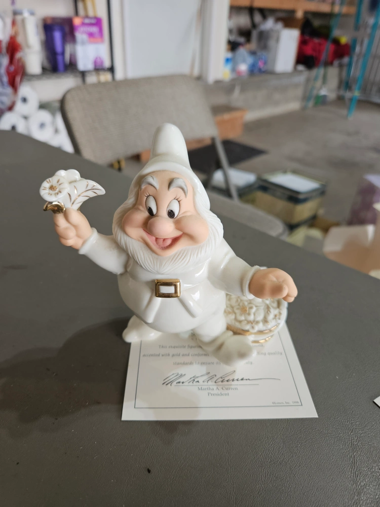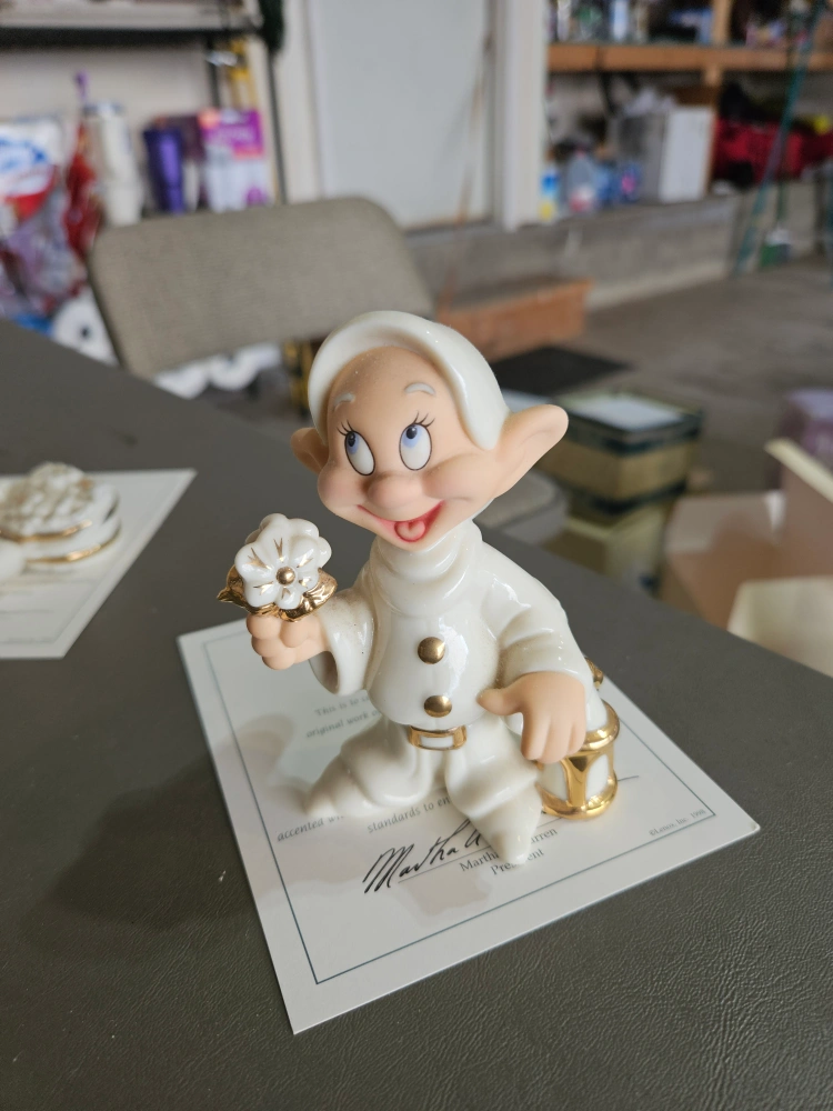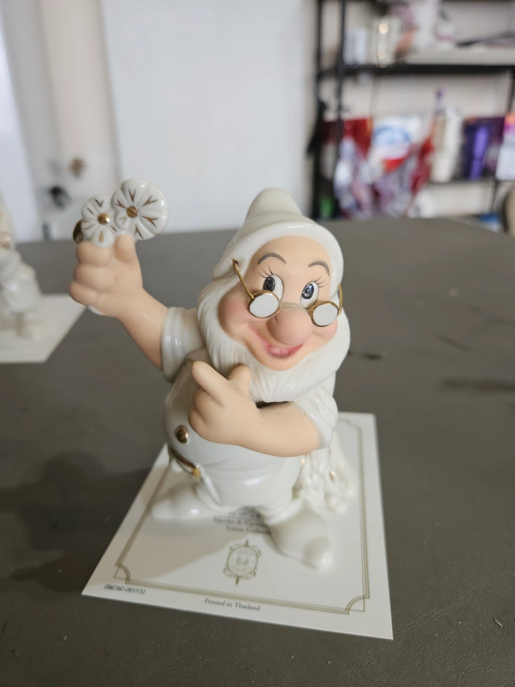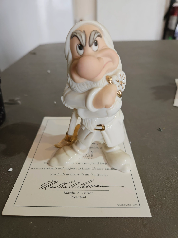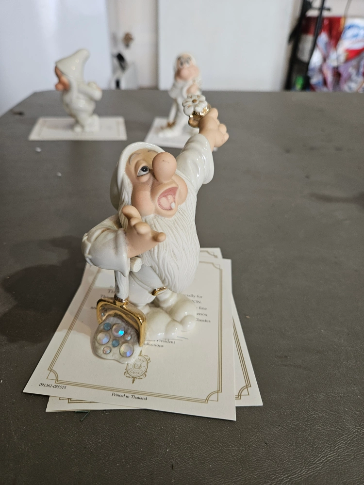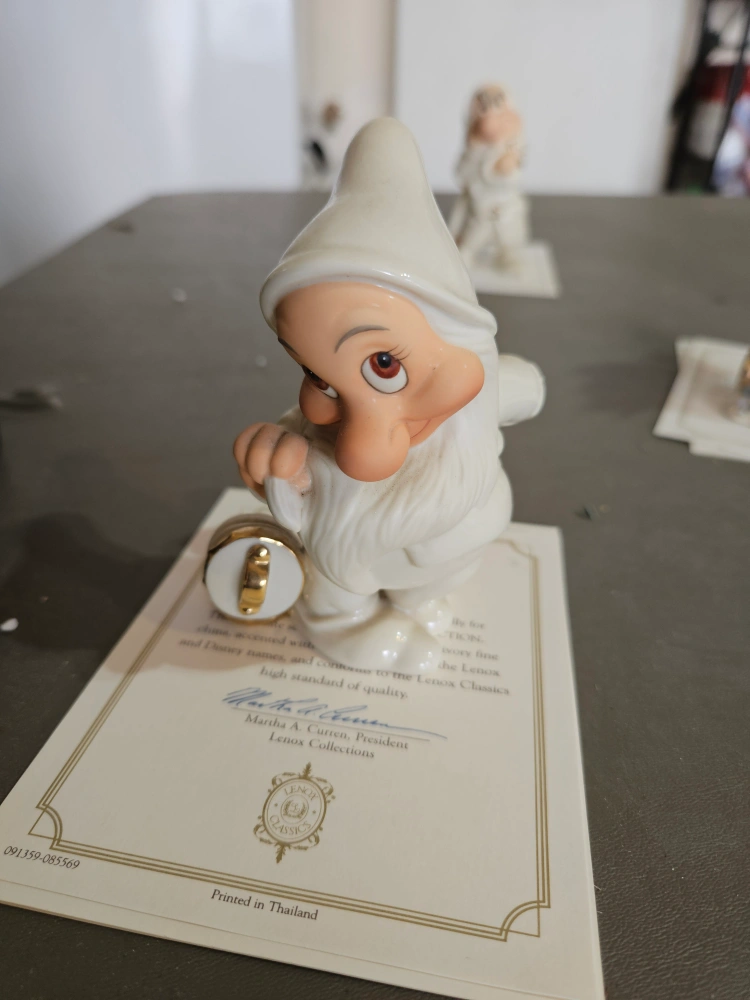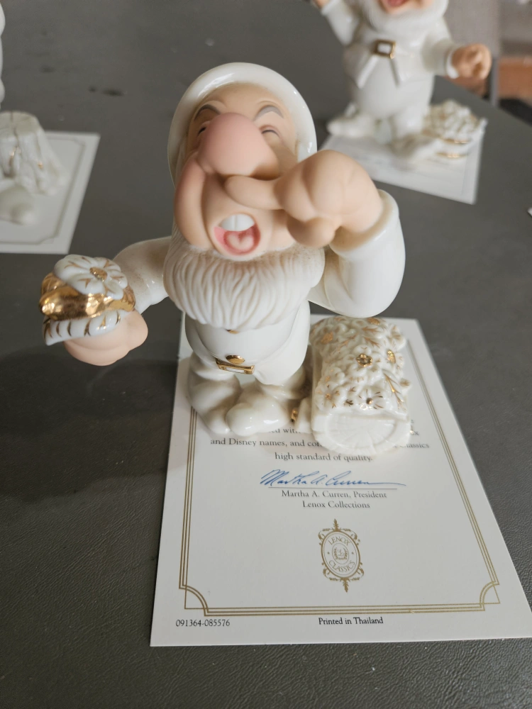 Selling a set of Lenox porcelain figurines depicting the Seven Dwarfs. These are crafted of ivory fine china, accented with gold, and conform to Lenox Classics' exacting standards. Each figurine comes with a certificate signed by Martha A. Curran, President of Lenox Collections. They were printed in Thailand in 1998. They all come with original boxes and certificate of authenticity.