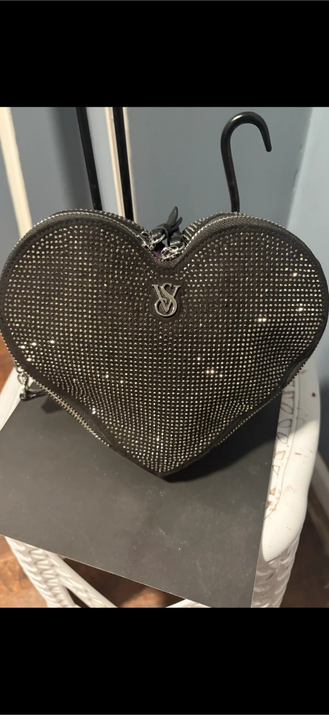 Selling a cute Victoria's Secret heart-shaped bag! It's black and covered in rhinestones, adding a touch of sparkle to any outfit